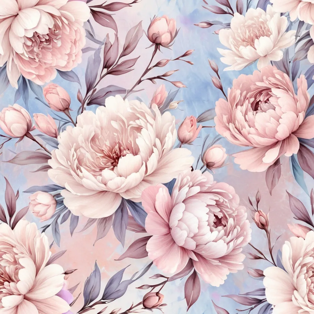 Seamless pattern in a soft pastel art style. Loose , expressive strokes depicting a flow of blooming flowers: peonies , roses , and blossoming branches. Watercolor-pastel effect , with colors bleeding gently into each other. A romantic and joyful palette of blush pink , powder blue , mauve , and cream. Perfect for a feminine March 8th greeting card design. Textured , artistic background. ,