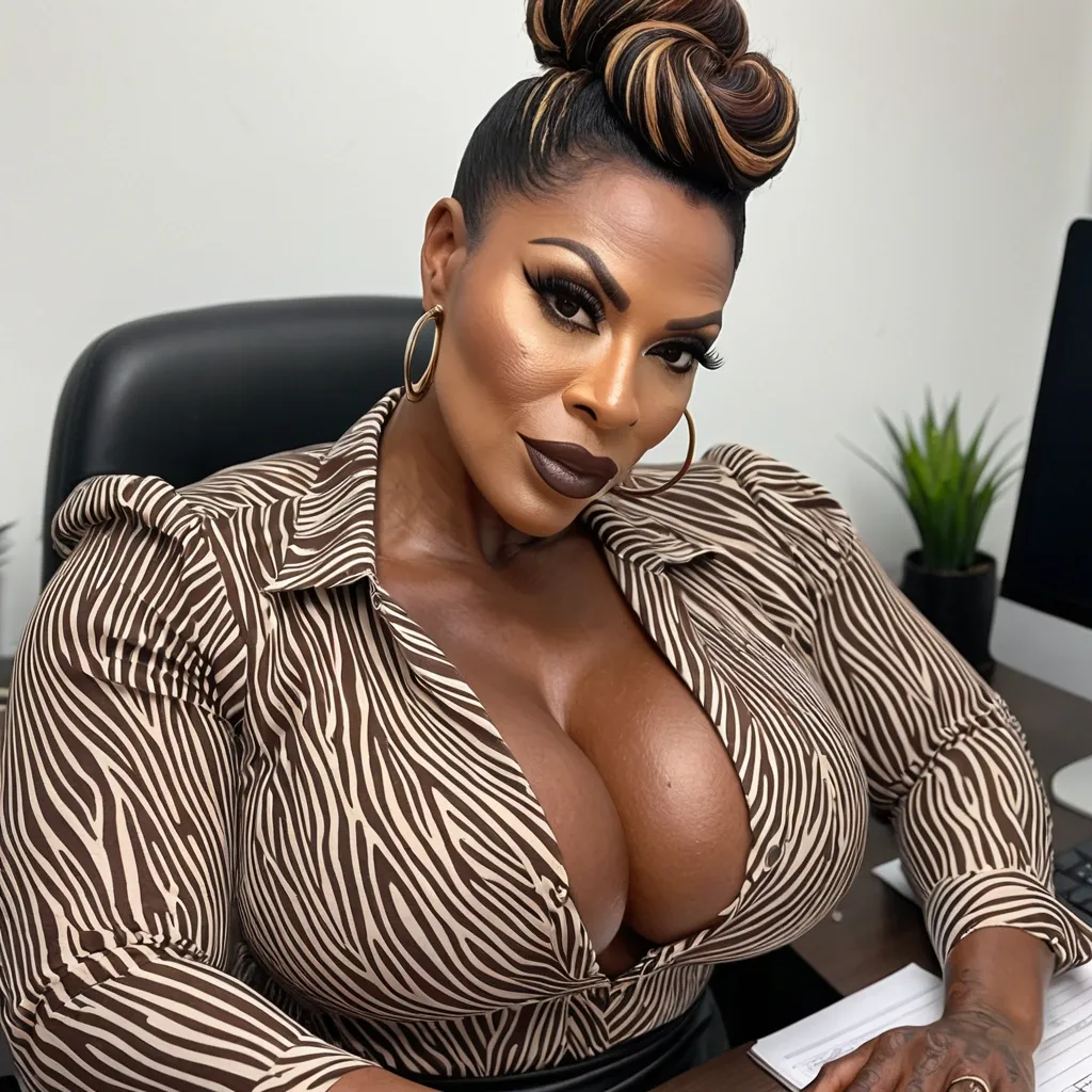 Generate Gorgeous female boss , bimbo , 42 years old , African-American woman , , , hourglass body , abnormally massive female bodybuilder , gorgeous , close up , full lips , big booty , brown pixie updo hair , short hair , feminine silhouette , too big breast , big booty , sexy thighs abs , silhouette , up close , flexing biceps , beautiful brown eyes , legs are iconic and defining physical feature , both visually and in terms of combat ability.wearing an outfit that is a striking blend of elegance , power , and femininity , designed to command attention in any room. The suit is tailored to perfection , hugging the wearer’s curves with precision while emphasizing a structured silhouette. The fabric itself is a refined grey tweed patterned with subtle white grid lines , giving the suit a texture that feels both sophisticated and modern. The blazer features broad blue lapels and gold button accents , adding a luxurious touch that elevates the look beyond typical business attire. The matching high-waisted trousers elongate the frame , further enhancing the poised and commanding effect of the ensemble.The styling choices amplify the boldness of the suit. The inner blouse is a silky , greybutton-down shirt that complements the tweed’s tone while introducing a softer , feminine balance to the sharp tailoring of the jacket. The blouse peeks out neatly from under the blazer , maintaining elegance without drawing focus away from the suit’s commanding cut. Accessories are kept minimal yet intentional: a delicate layered gold necklace and hoop earrings that add glimmers of light and luxury without overpowering the outfit. The choice of voluminous , honey-brown braids cascading down her shoulders frames the face with both confidence and glamour , completing the commanding visual.Altogether , this look communicates a blend of authority and allure. It is business-ready yet fashion-forward , balancing corporate structure with vibrant femininity. The color palette blue , grey and gold avoids being overly delicate , instead embracing the richness of texture , structure , and presence. This is the kind of ensemble that speaks to ambition , sophistication , and personal style—ideal for someone who thrives in positions of influence but insists on expressing her individuality with bold elegance. It’s not just clothing—it’s a statement of power wrapped in grace. In luxury living legs that could crush a watermelon , skirt high boots are a bold and striking statement piece , crafted in glossy black patent leather that gives them a sleek , polished finish. Rising to just below the knee , the boots feature three adjustable buckle straps along the shaft , adding both edge and detail to their design. The towering stiletto heel , paired with a thick platform sole , creates an ultra-dramatic silhouette that elongates the leg and exudes power and confidence. With their combination of shine , height , and structure , these boots perfectly balance fierce femininity with high-fashion allure. High cheekbones , prominent jawline , gorgeous big brown eyes , freckles , enormous breast , zebra print oxford shirt , black skirt sitting at desk in office ,