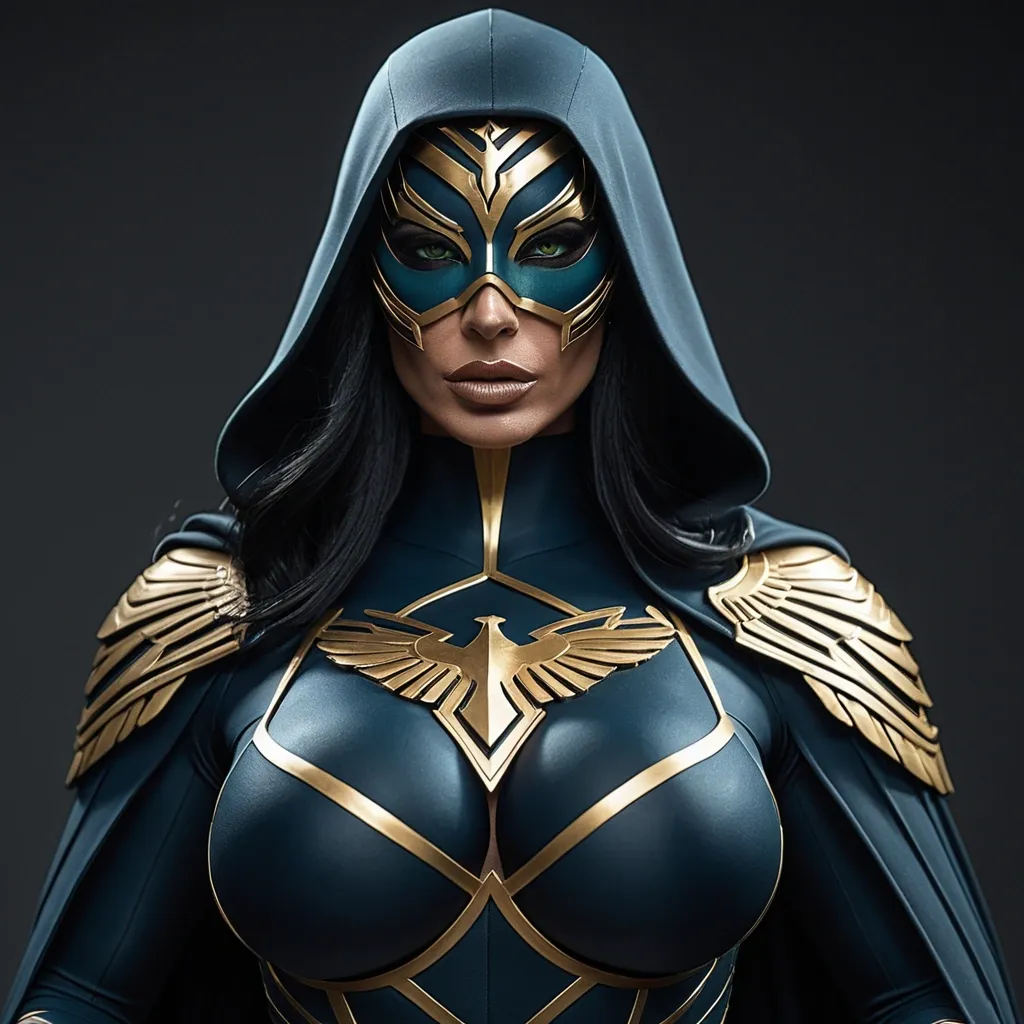Generate Gorgeous female boss , latina , bimbo , hourglass body , abnormally massive female bodybuilder , gorgeous , close up , full lips , big booty , black hair , freckles on face and breast , black stylish hair , feminine silhouette , too big breast , big booty , sexy thighs abs , silhouette , up close , flexing biceps , beautiful green eyes , legs are iconic and defining physical feature , both visually and in terms of combat ability.wearing an outfit that is a striking blend of elegance , power , and femininity , designed to command attention in any room. The suit is tailored to perfection , hugging the wearer’s curves with precision while emphasizing a structured silhouette. The fabric itself is a refined grey tweed patterned with subtle white grid lines , giving the suit a texture that feels both sophisticated and modern. The blazer features broad blue lapels and gold button accents , adding a luxurious touch that elevates the look beyond typical business attire. The matching high-waisted trousers elongate the frame , further enhancing the poised and commanding effect of the ensemble.The styling choices amplify the boldness of the suit. The inner blouse is a silky , greybutton-down shirt that complements the tweed’s tone while introducing a softer , feminine balance to the sharp tailoring of the jacket. The blouse peeks out neatly from under the blazer , maintaining elegance without drawing focus away from the suit’s commanding cut. Accessories are kept minimal yet intentional: a delicate layered gold necklace and hoop earrings that add glimmers of light and luxury without overpowering the outfit. The choice of voluminous , honey-brown braids cascading down her shoulders frames the face with both confidence and glamour , completing the commanding visual.Altogether , this look communicates a blend of authority and allure. It is business-ready yet fashion-forward , balancing corporate structure with vibrant femininity. The color palette blue , grey and gold avoids being overly delicate , instead embracing the richness of texture , structure , and presence. This is the kind of ensemble that speaks to ambition , sophistication , and personal style—ideal for someone who thrives in positions of influence but insists on expressing her individuality with bold elegance. It’s not just clothing—it’s a statement of power wrapped in grace. In luxury living legs that could crush a watermelon , skirt high boots are a bold and striking statement piece , crafted in glossy black patent leather that gives them a sleek , polished finish. Rising to just below the knee , the boots feature three adjustable buckle straps along the shaft , adding both edge and detail to their design. The towering stiletto heel , paired with a thick platform sole , creates an ultra-dramatic silhouette that elongates the leg and exudes power and confidence. With their combination of shine , height , and structure , these boots perfectly balance fierce femininity with high-fashion allure. High cheekbones , prominent jawline , gorgeous big green eyes , The suit is tailored to perfection , hugging the wearer’s curves with precision while emphasizing a structured silhouette. The fabric itself is a refined hood is a sleek , shadowed piece of her attire that falls close around her head and face , designed to enhance her aura of mystery and command. It is constructed from a matte black material that absorbs the light rather than reflecting it , giving her an ominous , almost spectral presence. The hood frames her face sharply and extends back into her cape , making her silhouette formidable and cohesive in its dark elegance. Its cut and fit are tailored to stay close to her head , preventing it from obstructing her vision while still cloaking her in an air of secrecy.Her mask is sharp , angular , and striking in its design. Black in color and sculpted to fit tightly against her face , it covers the area around her eyes with precision. Its edges sweep into bold curves that sharpen her gaze , emphasizing her piercing eyes and amplifying the intensity of her expression. The mask isn’t just a disguise—it acts as a symbol of her commitment , projecting authority and determination. With its seamless integration into her look , the mask gives her a sense of duality: a woman hidden yet revealed , a protector whose eyes burn with resolve.The superhero top is a masterpiece of tactical artistry and symbolism. Made from high-grade , form-fitted navy blue material that molds seamlessly to her muscular frame , it balances power with elegance. Across her chest spreads the golden emblem of a soaring eagle—wings outstretched , poised in eternal flight—representing her vow to uphold justice and truth. Gold lines accentuate her physique , converging in a V-shaped pattern that not only reinforces her strength but also adds a regal , almost ceremonial presence. This design makes her top both armor and declaration , a visual oath in itself. embracing the richness of texture , structure , and presence. This is the kind of ensemble that speaks to ambition , sophistication , and personal style—ideal for someone who thrives in positions of influence but insists on expressing her individuality with bold elegance. It’s not just clothing—it’s a statement of power wrapped in grace. Half mask , exposing hair , exposing mouth golden eagle emblem on chest. Cape , stacked hourglass silhouette ,