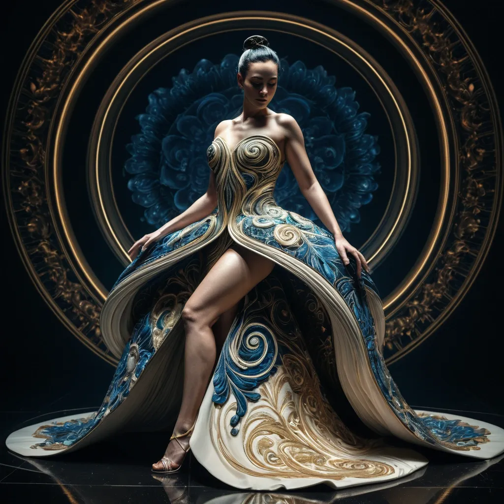 A mature fatty woman with dark hair tied in a sleek ponytail , wearing an elaborate strapless gown made of Fractal Flora , posing elegantly with hands on her hip and head tilted back , one leg bent and foot raised , against a dark catwalk-stage background. The gown flows into a dramatic train that forms a large , vortex on the ground. Style: Photo-realistic , Conceptual Art Lighting: Dramatic Studio Lighting , Spotlight Composition: Full body shot , dynamic pose , central focus with a grand , swirling element Details: Intricate embroidery on the dress and sculptural elements , high contrast between silk-toned golden and creamy blue , smooth skin texture , graceful human form , conceptual and architectural elements. Quality: High Detail , 8K , Masterpiece , Rendered with meticulous texture and reflective surfaces ,
