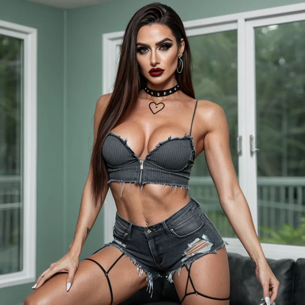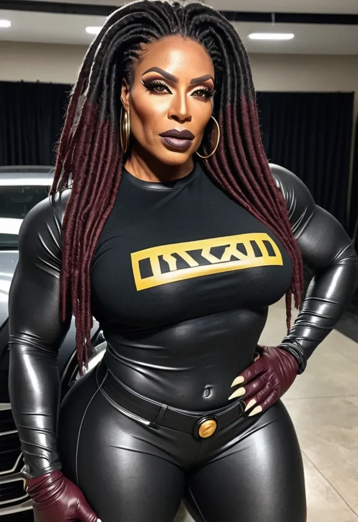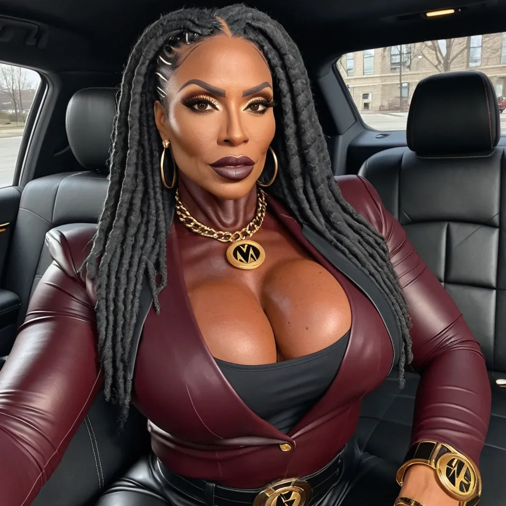Generate Gorgeous female boss , bimbo , 42 years old , very dark-skinned African-American woman , brown hair , gorgeous hazel eyes , hourglass body , abnormally massive female bodybuilder , gorgeous , close up , full lips , big booty , dreadlocks feminine silhouette , too big breast , big booty , sexy thighs abs , silhouette , up close , flexing biceps , beautiful hazel eyes , legs are iconic and defining physical feature , both visually and in terms of combat ability.wearing an outfit that is a striking blend of elegance , power , and femininity , designed to command attention in any room. The suit is tailored to perfection , hugging the wearer’s curves with precision while emphasizing a structured silhouette. The fabric itself is a refined grey tweed patterned with subtle white grid lines , giving the suit a texture that feels both sophisticated and modern. The blazer features broad blue lapels and gold button accents , adding a luxurious touch that elevates the look beyond typical business attire. The matching high-waisted trousers elongate the frame , further enhancing the poised and commanding effect of the ensemble.The styling choices amplify the boldness of the suit. The inner blouse is a silky , greybutton-down shirt that complements the tweed’s tone while introducing a softer , feminine balance to the sharp tailoring of the jacket. The blouse peeks out neatly from under the blazer , maintaining elegance without drawing focus away from the suit’s commanding cut. Accessories are kept minimal yet intentional: a delicate layered gold necklace and hoop earrings that add glimmers of light and luxury without overpowering the outfit. The choice of voluminous , honey-brown braids cascading down her shoulders frames the face with both confidence and glamour , completing the commanding visual.Altogether , this look communicates a blend of authority and allure. It is business-ready yet fashion-forward , balancing corporate structure with vibrant femininity. The color palette blue , grey and gold avoids being overly delicate , instead embracing the richness of texture , structure , and presence. This is the kind of ensemble that speaks to ambition , sophistication , and personal style—ideal for someone who thrives in positions of influence but insists on expressing her individuality with bold elegance. It’s not just clothing—it’s a statement of power wrapped in grace. In luxury living legs that could crush a watermelon , skirt high boots are a bold and striking statement piece , crafted in glossy black patent leather that gives them a sleek , polished finish. Rising to just below the knee , the boots feature three adjustable buckle straps along the shaft , adding both edge and detail to their design. The towering stiletto heel , paired with a thick platform sole , creates an ultra-dramatic silhouette that elongates the leg and exudes power and confidence. With their combination of shine , height , and structure , these boots perfectly balance fierce femininity with high-fashion allure. High cheekbones , prominent jawline , gorgeous big brown eyes , freckles , enormous breast , enormous butt , black , gray and gold button t-shirt , black work pants , dark burgundy leather coat and matching gloves sitting in limo , black , gray and gold button t-shirt , black , gray and gold button t-shirt , gold and burgundy diamond necklace ,