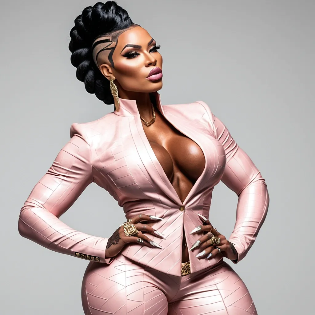 Generate a very dark-skinned , African-American woman , gorgeous female boss , bimbo , hourglass body , abnormally massive female bodybuilder , gorgeous hazel eyes , close up , full lips , big booty , black hair , braided mohawk designer style hair , bald on the side , feminine silhouette , too big breast , big booty , sexy thighs abs , silhouette , up close , flexing biceps , beautiful hazel eyes , legs are iconic and defining physical feature , both visually and in terms of combat ability.wearing an outfit that is a striking blend of elegance , power , and femininity , designed to command attention in any room. The suit is tailored to perfection , hugging the wearer’s curves with precision while emphasizing a structured silhouette. The fabric itself is a refined pink tweed patterned with subtle white grid lines , giving the suit a texture that feels both sophisticated and modern. The blazer features broad white lapels and gold button accents , adding a luxurious touch that elevates the look beyond typical business attire. The matching high-waisted trousers elongate the frame , further enhancing the poised and commanding effect of the ensemble.The styling choices amplify the boldness of the suit. The inner blouse is a silky , blush-pink button-down shirt that complements the tweed’s tone while introducing a softer , feminine balance to the sharp tailoring of the jacket. The blouse peeks out neatly from under the blazer , maintaining elegance without drawing focus away from the suit’s commanding cut. Accessories are kept minimal yet intentional: a delicate layered gold necklace and hoop earrings that add glimmers of light and luxury without overpowering the outfit. The choice of voluminous , honey-brown braids cascading down her shoulders frames the face with both confidence and glamour , completing the commanding visual.Altogether , this look communicates a blend of authority and allure. It is business-ready yet fashion-forward , balancing corporate structure with vibrant femininity. The color palette of black , gray , and gold avoids being overly delicate , instead embracing the richness of texture , structure , and presence. This is the kind of ensemble that speaks to ambition , sophistication , and personal style—ideal for someone who thrives in positions of influence but insists on expressing her individuality with bold elegance. It’s not just clothing—it’s a statement of power wrapped in grace. Gorgeous hazel eyes , stacked hourglass silhouette p , enormous butt , enormous breast ,