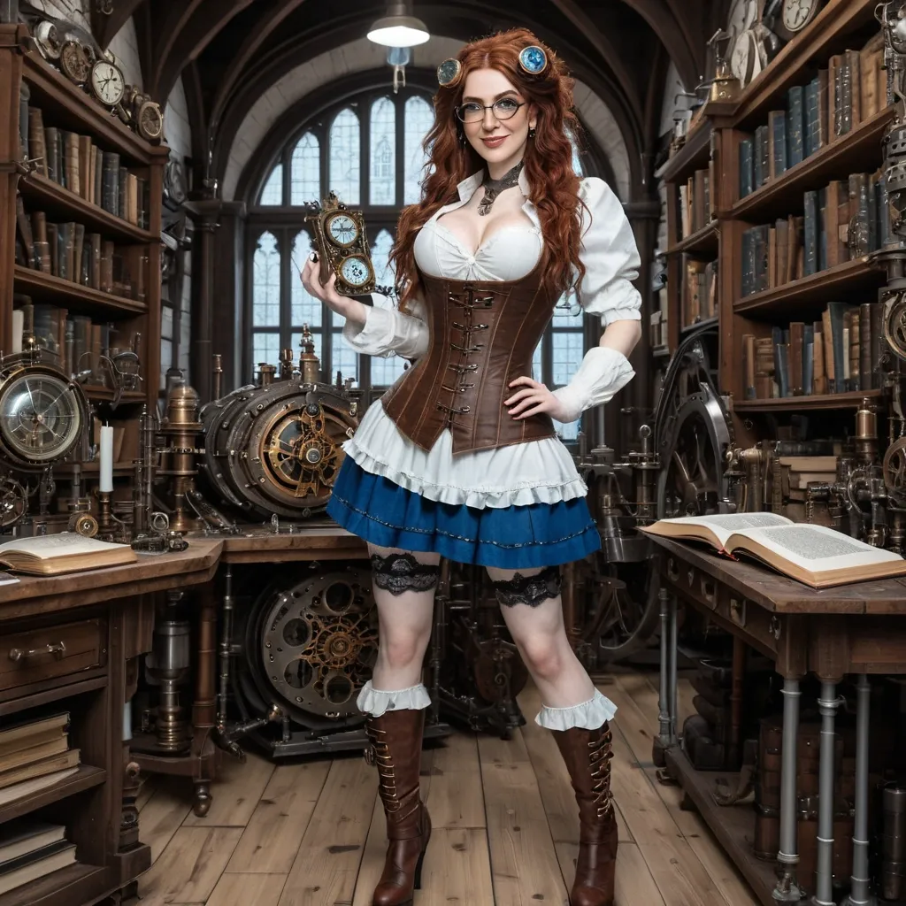 Masterpiece realistic full lenght white steampunk open lace shirt , brown corset with clockworks parts , blue openside miniskirt , blue boots , long auburn wavy hair , white pale freckled 21yo european woman with glasses , she standing up a hand on her hip and steampunk book in the other , she is in a steampunk laboratory full of book and machinery she have a little smile ,