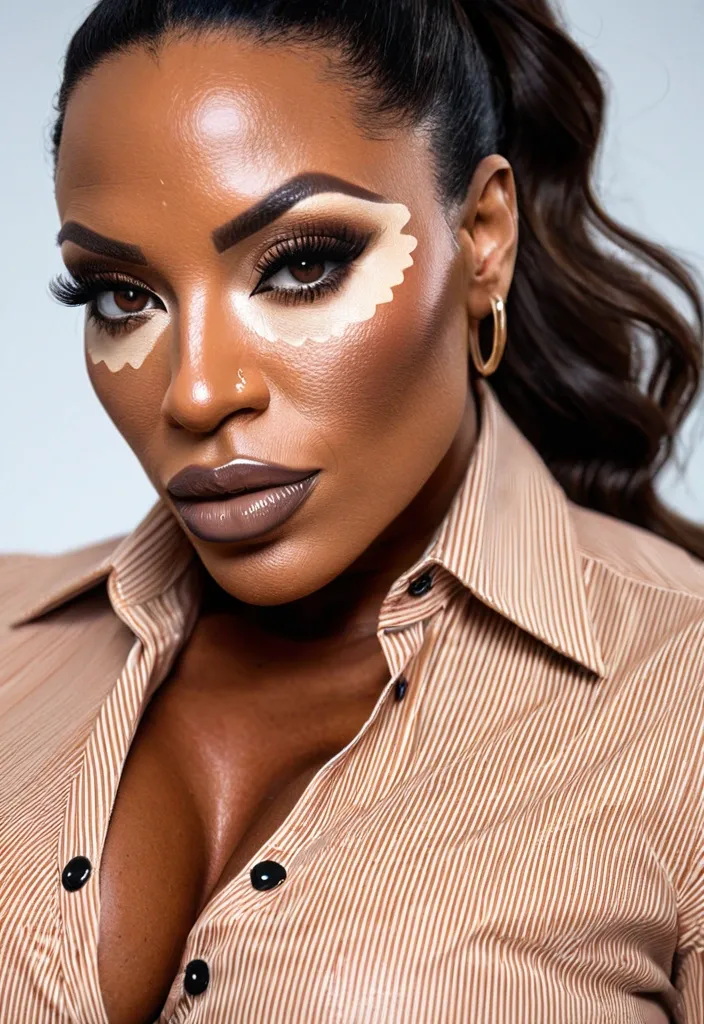 Generate Gorgeous female boss , bimbo , 42 years old , African-American woman , , , hourglass body , black mole subtle mole , over lip , beige lips gloss , abnormally massive female bodybuilder , gorgeous , close up , full lips , big booty , brown hair , in ponytail , feminine silhouette , too big breast , big booty , sexy thighs abs , silhouette , up close , flexing biceps , beautiful brown eyes , legs are iconic and defining physical feature , both visually and in terms of combat ability.wearing an outfit that is a striking blend of elegance , power , and femininity , designed to command attention in any room. The suit is tailored to perfection , hugging the wearer’s curves with precision while emphasizing a structured silhouette. The fabric itself is a refined grey tweed patterned with subtle white grid lines , giving the suit a texture that feels both sophisticated and modern. The blazer features broad blue lapels and gold button accents , adding a luxurious touch that elevates the look beyond typical business attire. The matching high-waisted trousers elongate the frame , further enhancing the poised and commanding effect of the ensemble.The styling choices amplify the boldness of the suit. The inner blouse is a silky , greybutton-down shirt that complements the tweed’s tone while introducing a softer , feminine balance to the sharp tailoring of the jacket. The blouse peeks out neatly from under the blazer , maintaining elegance without drawing focus away from the suit’s commanding cut. Accessories are kept minimal yet intentional: a delicate layered gold necklace and hoop earrings that add glimmers of light and luxury without overpowering the outfit. The choice of voluminous , honey-brown braids cascading down her shoulders frames the face with both confidence and glamour , completing the commanding visual.Altogether , this look communicates a blend of authority and allure. It is business-ready yet fashion-forward , balancing corporate structure with vibrant femininity. The color palette blue , grey and gold avoids being overly delicate , instead embracing the richness of texture , structure , and presence. This is the kind of ensemble that speaks to ambition , sophistication , and personal style—ideal for someone who thrives in positions of influence but insists on expressing her individuality with bold elegance. It’s not just clothing—it’s a statement of power wrapped in grace. In luxury living legs that could crush a watermelon , skirt high boots are a bold and striking statement piece , crafted in glossy black patent leather that gives them a sleek , polished finish. Rising to just below the knee , the boots feature three adjustable buckle straps along the shaft , adding both edge and detail to their design. The towering stiletto heel , paired with a thick platform sole , creates an ultra-dramatic silhouette that elongates the leg and exudes power and confidence. With their combination of shine , height , and structure , these boots perfectly balance fierce femininity with high-fashion allure. High cheekbones , prominent jawline , gorgeous big brown eyes , freckles , enormous breast , bluish beige and orange chevrons designed oxford shirt , goosebumps on chest , denim pants , up close shot ,