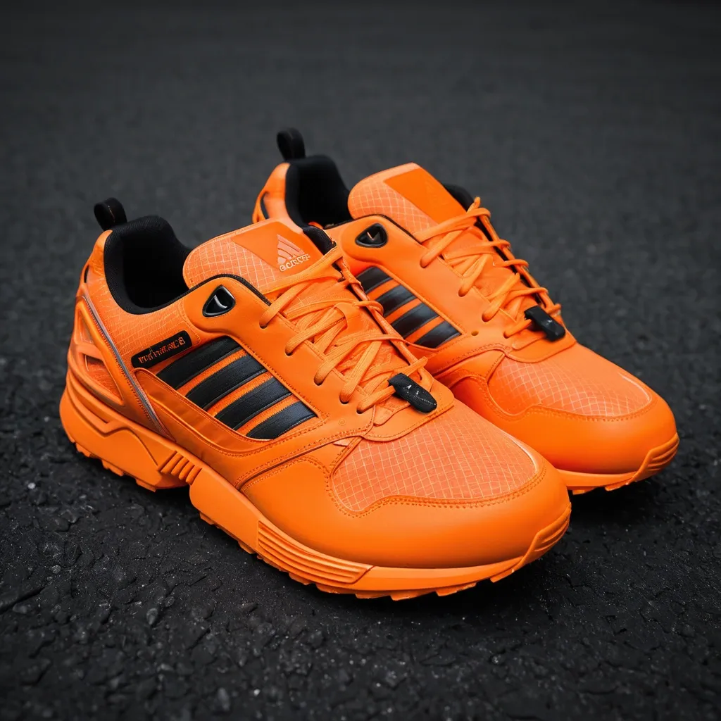 Professional studio lookbook photography of an authentic Adidas ZX 8000. THEME: BSR "Workwear Utility". TEXTURES: The upper is constructed from neon-orange Ripstop nylon , mimicking the BSR work trousers. DETAILS: - Overlays feature double-reinforced "heavy-thread" zigzag stitching in neon orange. - The tongue is made of a breathable neon-orange safety mesh. - The three stripes are made of the matte silver 3M reflective material. - TPU HEEL CAGE: Matte , industrial rubber finish , NO logos , NO text. - Laces: Thick , round hiking-style paracord in orange/black. - CAMERA: Hasselblad H6D , 100mm lens. - SOLE: asphalt textured. Torsion oanel is neon-orange - NO logos on sole or heel cage. ,