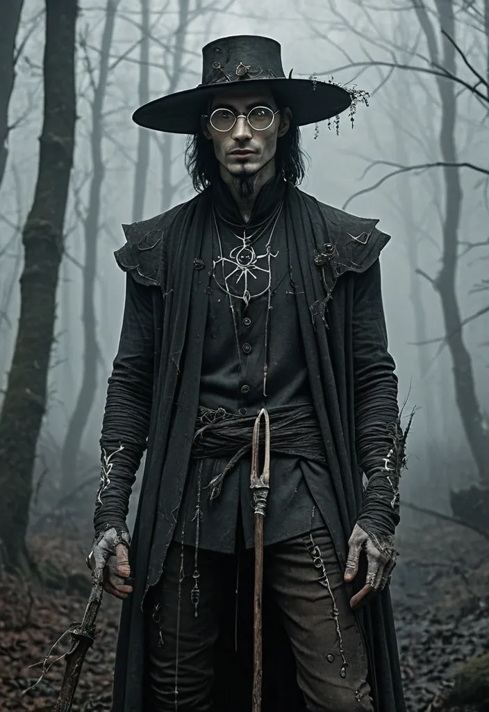 Remin — Dark Fantasy Herbalist A tall , extremely thin young man with an elongated , almost unreal silhouette , as if he could fade from reality. Short dark hair with an ash-gray undertone. Calm , soft facial features. Thin glasses with a cracked lens. A rare , slightly unsettling smile — like someone who knows forgotten truths. He wears intentionally torn , ancient rural clothing: a long dark shirt embroidered with herbal symbols and fragments of spells; a rough vest soaked in plant infusions and dried herbal blood; patched trousers , each patch from a different era; legs wrapped in old bandages. Worn yet aesthetic , every tear deliberate. On his head — a wide-brimmed dark hat entwined by a white two-headed snake familiar. He holds a scythe , its blade covered with thin runes and traces of dried alchemical infusions. Around him float faint halo-like rings and cracks in reality , subtle fractures in the air. His presence radiates eerie calm and memory loss. Style: dark fantasy , gothic , painterly realism , cinematic lighting Mood: eerie serenity , melancholic , mystical Details: ultra-detailed , high quality , soft fog , muted colors , ancient magic ,