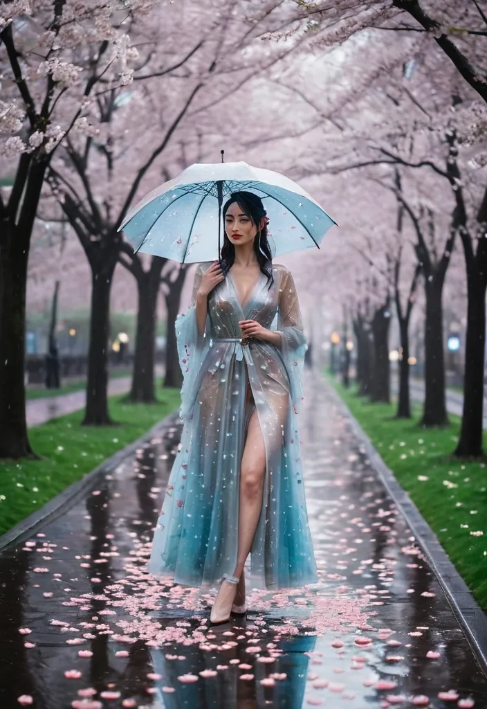 A quiet city park path during a spring shower , lined with cherry blossom trees in full bloom. The rain creates a soft , misty atmosphere , and fallen petals carpet the path. full body view of most beautiful woman , adorned in dress made of iridescent , bioluminescent fabrics that mimic intricate tiny drops shapes. A delicate young woman with a serene expression , standing on a rain-slicked path. She holds a vibrant , oversized umbrella adorned with cherry blossoms. The gentle spring rain causes petals to swirl around her. A vintage-style lamppost casts a warm , inviting glow on the wet scene. The overall mood is peaceful and contemplative. Cinematic film still with a shallow depth of field , capturing the beauty of nature after rain. ,