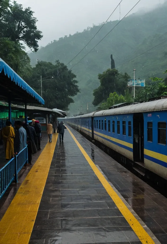 A quiet city park path during a spring shower , the Mussoorie Express train standing at Dehradun railway station in Uttarakhand , India. The Indian Railways train with blue coaches is parked on the platform , with colorful , umbrellas holding by passengers walking on the platform , vendors nearby , and luggage around. The station board “DEHRADUN” is clearly visible in yellow and black. Background shows subtle hills and greenery , capturing the calm Himalayan gateway vibe. Cinematic film still with a shallow depth of field , capturing the beauty of nature after rain. ,