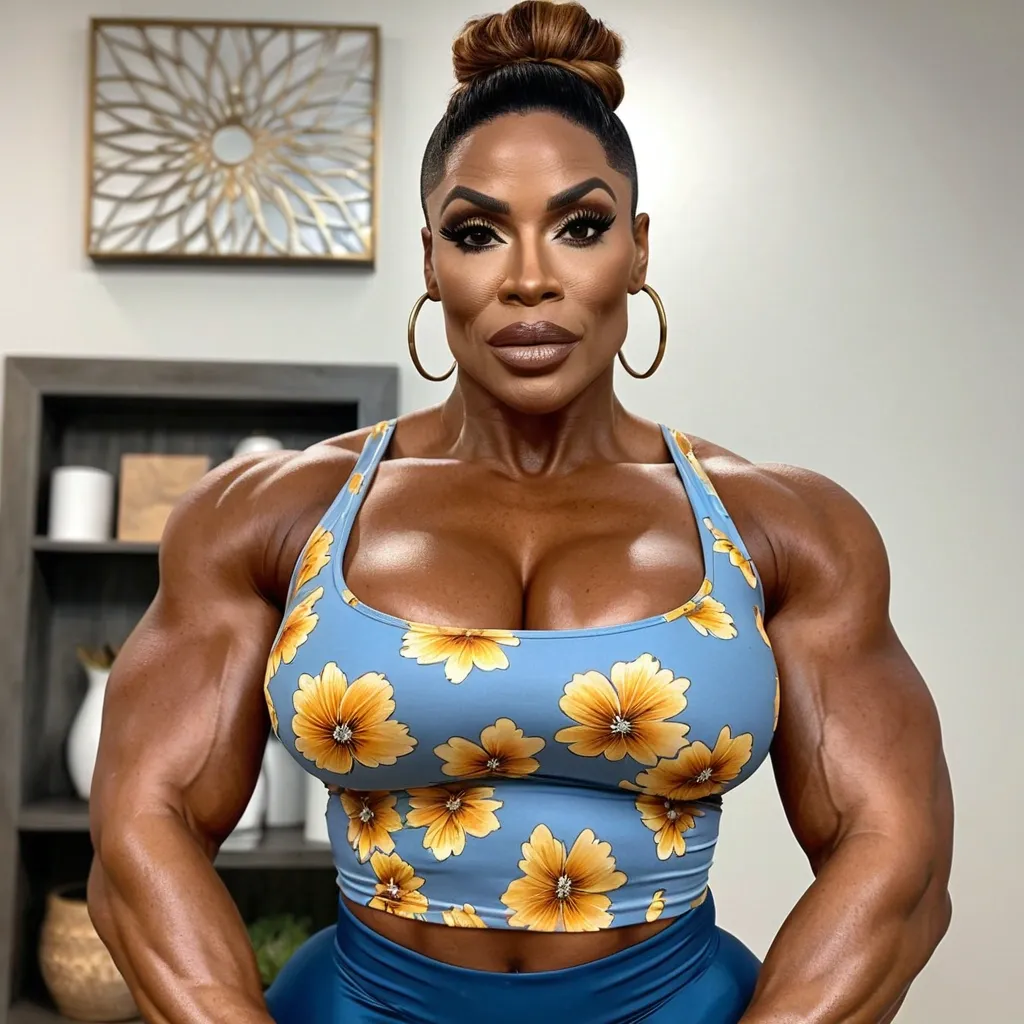 Generate Gorgeous female boss , 42 years old , bimbo , African-American woman , , , hourglass body , abnormally massive female bodybuilder , gorgeous , close up , full lips , big booty , brown pixie updo hair , short hair , feminine silhouette , too big breast , big booty , sexy thighs abs , silhouette , up close , flexing biceps , beautiful brown eyes , legs are iconic and defining physical feature , both visually and in terms of combat ability.wearing an outfit that is a striking blend of elegance , power , and femininity , designed to command attention in any room. The suit is tailored to perfection , hugging the wearer’s curves with precision while emphasizing a structured silhouette. The fabric itself is a refined grey tweed patterned with subtle white grid lines , giving the suit a texture that feels both sophisticated and modern. The blazer features broad blue lapels and gold button accents , adding a luxurious touch that elevates the look beyond typical business attire. The matching high-waisted trousers elongate the frame , further enhancing the poised and commanding effect of the ensemble.The styling choices amplify the boldness of the suit. The inner blouse is a silky , greybutton-down shirt that complements the tweed’s tone while introducing a softer , feminine balance to the sharp tailoring of the jacket. The blouse peeks out neatly from under the blazer , maintaining elegance without drawing focus away from the suit’s commanding cut. Accessories are kept minimal yet intentional: a delicate layered gold necklace and hoop earrings that add glimmers of light and luxury without overpowering the outfit. The choice of voluminous , honey-brown braids cascading down her shoulders frames the face with both confidence and glamour , completing the commanding visual.Altogether , this look communicates a blend of authority and allure. It is business-ready yet fashion-forward , balancing corporate structure with vibrant femininity. The color palette blue , grey and gold avoids being overly delicate , instead embracing the richness of texture , structure , and presence. This is the kind of ensemble that speaks to ambition , sophistication , and personal style—ideal for someone who thrives in positions of influence but insists on expressing her individuality with bold elegance. It’s not just clothing—it’s a statement of power wrapped in grace. In luxury living legs that could crush a watermelon , skirt high boots are a bold and striking statement piece , crafted in glossy black patent leather that gives them a sleek , polished finish. Rising to just below the knee , the boots feature three adjustable buckle straps along the shaft , adding both edge and detail to their design. The towering stiletto heel , paired with a thick platform sole , creates an ultra-dramatic silhouette that elongates the leg and exudes power and confidence. With their combination of shine , height , and structure , these boots perfectly balance fierce femininity with high-fashion allure. High cheekbones , prominent jawline , gorgeous big brown eyes , freckles , enormous breast , blue and gold floral tank top , high rise grey shorts ,