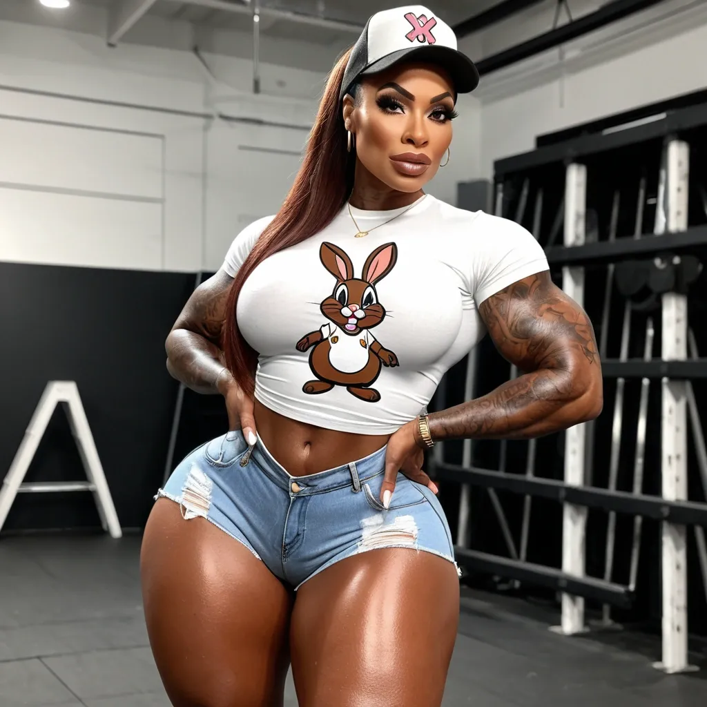 Generate Gorgeous female boss , bimbo , 42 years old , African-American woman , hourglass body , abnormally massive female bodybuilder , gorgeous , close up , full lips , big booty , ponytail cut , brown hair , feminine silhouette , too big breast , big booty , sexy thighs abs , silhouette , up close , flexing biceps , gorgeous brown eyes , legs are iconic and defining physical feature , both visually and in terms of combat ability.wearing an outfit that is a striking blend of elegance , power , and femininity , designed to command attention in any room. The suit is tailored to perfection , hugging the wearer’s curves with precision while emphasizing a structured silhouette. The fabric itself is a refined grey tweed patterned with subtle white grid lines , giving the suit a texture that feels both sophisticated and modern. The blazer features broad blue lapels and gold button accents , adding a luxurious touch that elevates the look beyond typical business attire. The matching high-waisted trousers elongate the frame , further enhancing the poised and commanding effect of the ensemble.The styling choices amplify the boldness of the suit. The inner blouse is a silky , greybutton-down shirt that complements the tweed’s tone while introducing a softer , feminine balance to the sharp tailoring of the jacket. The blouse peeks out neatly from under the blazer , maintaining elegance without drawing focus away from the suit’s commanding cut. Accessories are kept minimal yet intentional: a delicate layered gold necklace and hoop earrings that add glimmers of light and luxury without overpowering the outfit. The choice of voluminous , honey-brown braids cascading down her shoulders frames the face with both confidence and glamour , completing the commanding visual.Altogether , this look communicates a blend of authority and allure. It is business-ready yet fashion-forward , balancing corporate structure with vibrant femininity. The color palette blue , grey and gold avoids being overly delicate , instead embracing the richness of texture , structure , and presence. This is the kind of ensemble that speaks to ambition , sophistication , and personal style—ideal for someone who thrives in positions of influence but insists on expressing her individuality with bold elegance. It’s not just clothing—it’s a statement of power wrapped in grace. In luxury living legs that could crush a watermelon , skirt high boots are a bold and striking statement piece , crafted in glossy black patent leather that gives them a sleek , polished finish. Rising to just below the knee , the boots feature three adjustable buckle straps along the shaft , adding both edge and detail to their design. The towering stiletto heel , paired with a thick platform sole , creates an ultra-dramatic silhouette that elongates the leg and exudes power and confidence. With their combination of shine , height , and structure , these boots perfectly balance fierce femininity with high-fashion allure. High cheekbones , prominent jawline , gorgeous big brown eyes , freckles , enormous breast , collard shirt , white t-shirt with a cartoon bunny rabbit on the shirt and denim shorts , black baseball cap , waking at the fair , enormous butt , full body shot ,