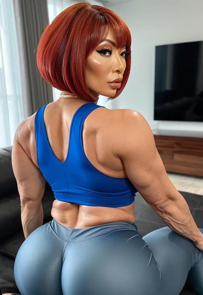 Generate Gorgeous female boss , bimbo , hourglass body , Japanese woman , abnormally massive female bodybuilder , gorgeous , close up , full lips , big booty , red hair , short bob-cut hair , , feminine silhouette , too big breast , big booty , sexy thighs abs , silhouette , up close , flexing biceps , beautiful brown eyes , legs are iconic and defining physical feature , both visually and in terms of combat ability.wearing an outfit that is a striking blend of elegance , power , and femininity , designed to command attention in any room. Outfit tailored to perfection , hugging the wearer’s curves with precision while emphasizing a structured silhouette. The fabric texture that feels both sophisticated and modern. The tank top features a luxurious touch that elevates the look beyond typical attire. The matching high-waisted shorts elongate the frame , further enhancing the poised and commanding effect of the ensemble.The styling choices amplify the boldness of the outfit. The outfit complements the tweed’s tone while introducing a softer , feminine balance to the sharp tailoring of the outfit. She is maintaining elegance without drawing focus away from the outfit commanding cut. Accessories are kept minimal yet intentional: a delicate layered gold necklace and hoop earrings that add glimmers of light and luxury without overpowering the outfit. The choice of voluminous , short bob-cut hair cascading down to her shoulders frames the face with both confidence and glamour , completing the commanding visual.Altogether , this look communicates a blend of authority and allure. It is fashion-forward , balancing corporate structure with vibrant femininity. The color palette blue tank top and grey short avoids being overly delicate , instead embracing the richness of texture , structure , and presence. This is the kind of ensemble that speaks to ambition , sophistication , and personal style—ideal for someone who thrives in positions of influence but insists on expressing her individuality with bold elegance. It’s not just clothing—it’s a statement of power wrapped in grace. In luxury living legs that could crush a cement block , she has a bold and striking statement piece , her big lips heart shaped lips in glossy red that gives them a sleek , polished finish. Adding both edge and detail to their design. The towering stiletto heel , paired with a thick platform sole , creates an ultra-dramatic silhouette that elongates the leg and exudes power and confidence. With their combination of shine , height , and structure , these boots perfectly balance fierce femininity with high-fashion allure. High cheekbones , prominent jawline , gorgeous big brown eyes , enormous breast , blue tank top , in living room , sitting on couch watching tv , grey pants , enormous butt , up close ,