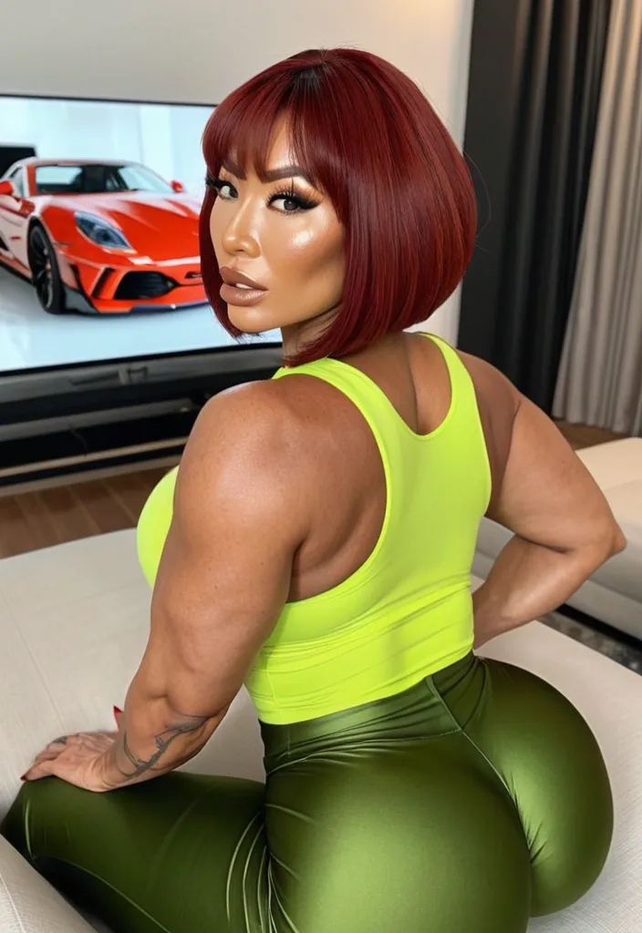 Generate Gorgeous female boss , bimbo , hourglass body , Japanese woman , abnormally massive female bodybuilder , gorgeous , close up , full lips , big booty , red hair , short bob-cut hair , , feminine silhouette , too big breast , big booty , sexy thighs abs , silhouette , up close , flexing biceps , beautiful brown eyes , legs are iconic and defining physical feature , both visually and in terms of combat ability.wearing an outfit that is a striking blend of elegance , power , and femininity , designed to command attention in any room. Outfit tailored to perfection , hugging the wearer’s curves with precision while emphasizing a structured silhouette. The fabric texture that feels both sophisticated and modern. The tank top features a luxurious touch that elevates the look beyond typical attire. The matching high-waisted shorts elongate the frame , further enhancing the poised and commanding effect of the ensemble.The styling choices amplify the boldness of the outfit. The outfit complements the tweed’s tone while introducing a softer , feminine balance to the sharp tailoring of the outfit. She is maintaining elegance without drawing focus away from the outfit commanding cut. Accessories are kept minimal yet intentional: a delicate layered gold necklace and hoop earrings that add glimmers of light and luxury without overpowering the outfit. The choice of voluminous , short bob-cut hair cascading down to her shoulders frames the face with both confidence and glamour , completing the commanding visual.Altogether , this look communicates a blend of authority and allure. It is fashion-forward , balancing corporate structure with vibrant femininity. The color palette blue tank top and grey short avoids being overly delicate , instead embracing the richness of texture , structure , and presence. This is the kind of ensemble that speaks to ambition , sophistication , and personal style—ideal for someone who thrives in positions of influence but insists on expressing her individuality with bold elegance. It’s not just clothing—it’s a statement of power wrapped in grace. In luxury living legs that could crush a cement block , she has a bold and striking statement piece , her big lips heart shaped lips in glossy red that gives them a sleek , polished finish. Adding both edge and detail to their design. The towering stiletto heel , paired with a thick platform sole , creates an ultra-dramatic silhouette that elongates the leg and exudes power and confidence. With their combination of shine , height , and structure , these boots perfectly balance fierce femininity with high-fashion allure. High cheekbones , prominent jawline , gorgeous big brown eyes , enormous breast , lime green tank top , in living room , sitting on couch watching tv , black pants , enormous butt ,