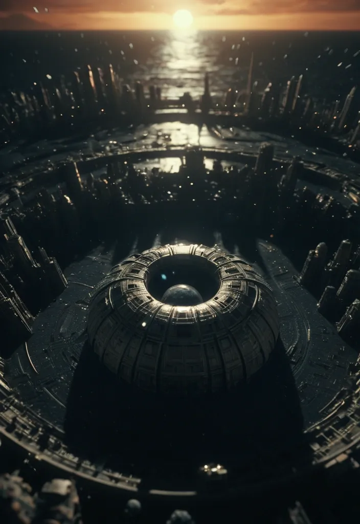 Cinematic deep space shot , camera completely locked and stationary. A massive triangle spacecraft mega-structure city built flying over space. The structure is perfectly still and unchanged , showing the entire base clearly from a wide angle. volumetric light gently cutting through the space , rich contrast with preserved shadow detail , warm highlights balanced against cool ambient tones , realistic film grain , slight halation around bright light sources , shallow depth of field , anamorphic lens look , 35mm motion picture film aesthetic , organic imperfections , moody atmosphere , frame looks extracted from a high-budget feature film. Dramatic sunset lighting over the water surface , creating highlights on the dive in air Gull-herring. High Detail , 4K , Masterpiece , Rendered in Octane , rich detailing --ar 16:9 --raw --stylize 200 ,