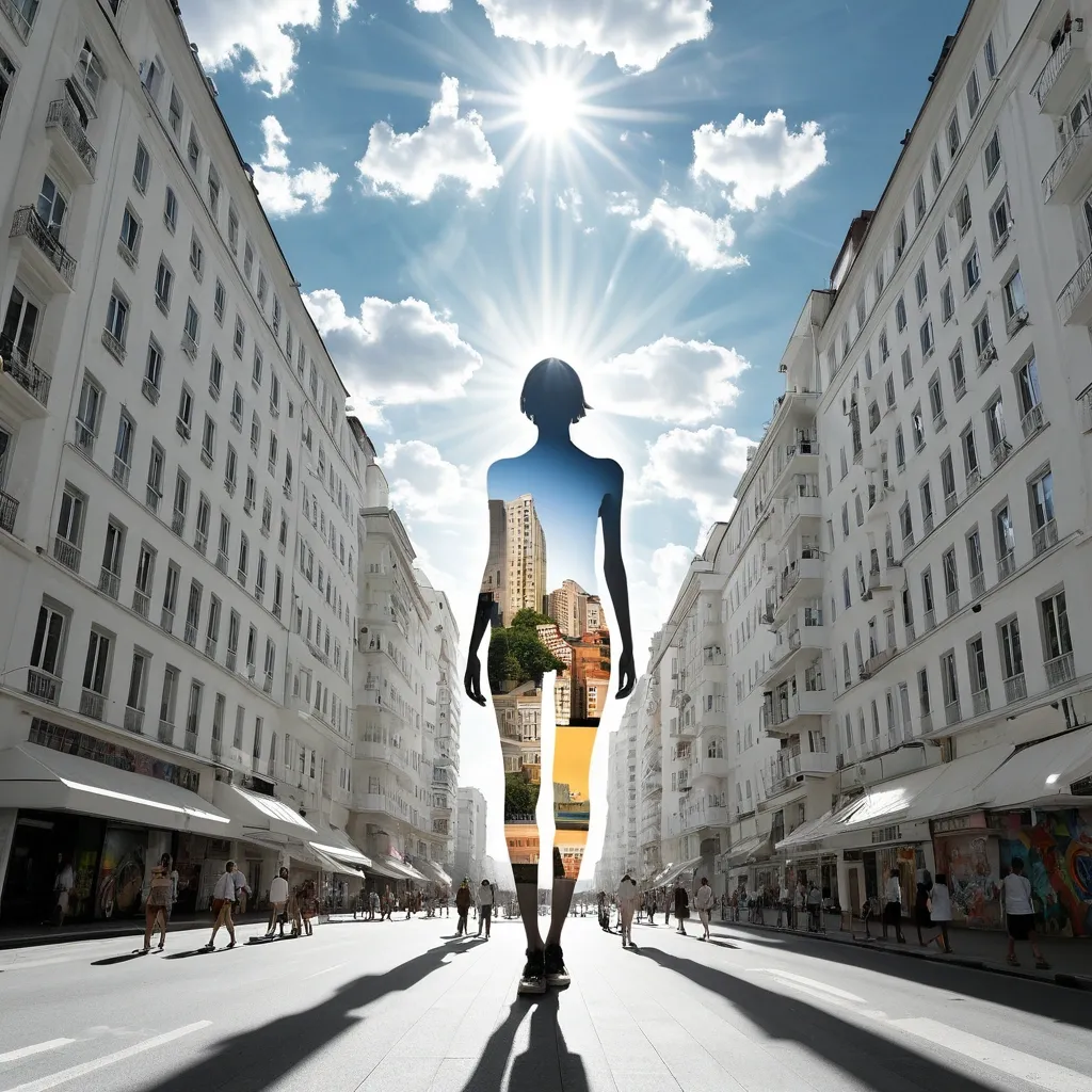 genera un ser con silueta humana esbelto y hemoso hecho completamente de fotos de edificios modernistas su mirada acogedora camina por las calles hechas de nubes blancas..es verano hay un sol radiante , edificios hechos de imagenes de personas , es un mundo inverso donde la vida adquiere nuevos patrones logico visuales hay mucho color , fondo fusion de realidad y fantasia ,