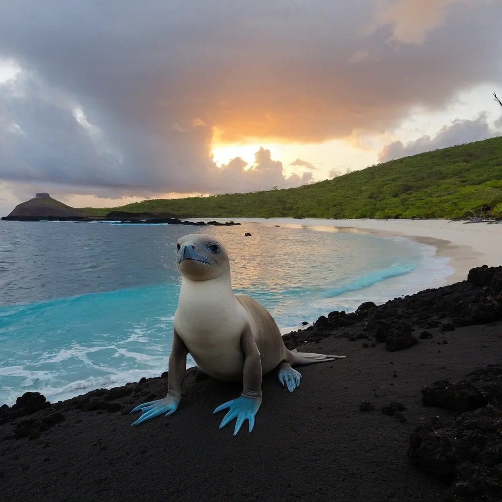 Las islas Galápagos del Ecuador , poseen una amplia variedad de especies nativas y endémicas , así como paisajes increíbles de playas como Tortuga Bay en la Isla Santa Cruz , con la presencia de piqueros patas azules , lobos marinos , tortugas marinas. Muchos turistas de todo el mundo visitan las islas Galápagos para aprender y apreciar procesos evolutivos de acuerdo a las investigaciones realizadas por Charles Darwin. Genera una imagen con un hermoso atardecer. ,