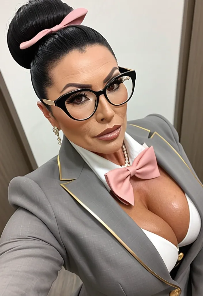 Generate Gorgeous female boss , bimbo , 42 years old , very dark-skinned African-American woman , brown hair , gorgeous hazel eyes , hourglass body , abnormally massive female bodybuilder , gorgeous , close up , full lips , big booty , dreadlocks feminine silhouette , too big breast , big booty , sexy thighs abs , silhouette , up close , flexing biceps , beautiful hazel eyes , legs are iconic and defining physical feature , both visually and in terms of combat ability.wearing an outfit that is a striking blend of elegance , power , and femininity , designed to command attention in any room. The suit is tailored to perfection , hugging the wearer’s curves with precision while emphasizing a structured silhouette. The fabric itself is a refined grey tweed patterned with subtle white grid lines , giving the suit a texture that feels both sophisticated and modern. The blazer features broad blue lapels and gold button accents , adding a luxurious touch that elevates the look beyond typical business attire. The matching high-waisted trousers elongate the frame , further enhancing the poised and commanding effect of the ensemble.The styling choices amplify the boldness of the suit. The inner blouse is a silky , greybutton-down shirt that complements the tweed’s tone while introducing a softer , feminine balance to the sharp tailoring of the jacket. The blouse peeks out neatly from under the blazer , maintaining elegance without drawing focus away from the suit’s commanding cut. Accessories are kept minimal yet intentional: a delicate layered gold necklace and hoop earrings that add glimmers of light and luxury without overpowering the outfit. The choice of voluminous , honey-brown braids cascading down her shoulders frames the face with both confidence and glamour , completing the commanding visual.Altogether , this look communicates a blend of authority and allure. It is business-ready yet fashion-forward , balancing corporate structure with vibrant femininity. The color palette blue , grey and gold avoids being overly delicate , instead embracing the richness of texture , structure , and presence. This is the kind of ensemble that speaks to ambition , sophistication , and personal style—ideal for someone who thrives in positions of influence but insists on expressing her individuality with bold elegance. It’s not just clothing—it’s a statement of power wrapped in grace. In luxury living legs that could crush a watermelon , skirt high boots are a bold and striking statement piece , crafted in glossy black patent leather that gives them a sleek , polished finish. Rising to just below the knee , the boots feature three adjustable buckle straps along the shaft , adding both edge and detail to their design. The towering stiletto heel , paired with a thick platform sole , creates an ultra-dramatic silhouette that elongates the leg and exudes power and confidence. With their combination of shine , height , and structure , these boots perfectly balance fierce femininity with high-fashion allure. High cheekbones , prominent jawline , gorgeous big brown eyes , freckles , enormous breast , enormous butt , black , gray and gold button t-shirt , black work pants , dark burgundy leather coat and matching gloves sitting in limo , black , gray and gold button t-shirt , black , gray and gold button t-shirt , gold and burgundy diamond necklace ,