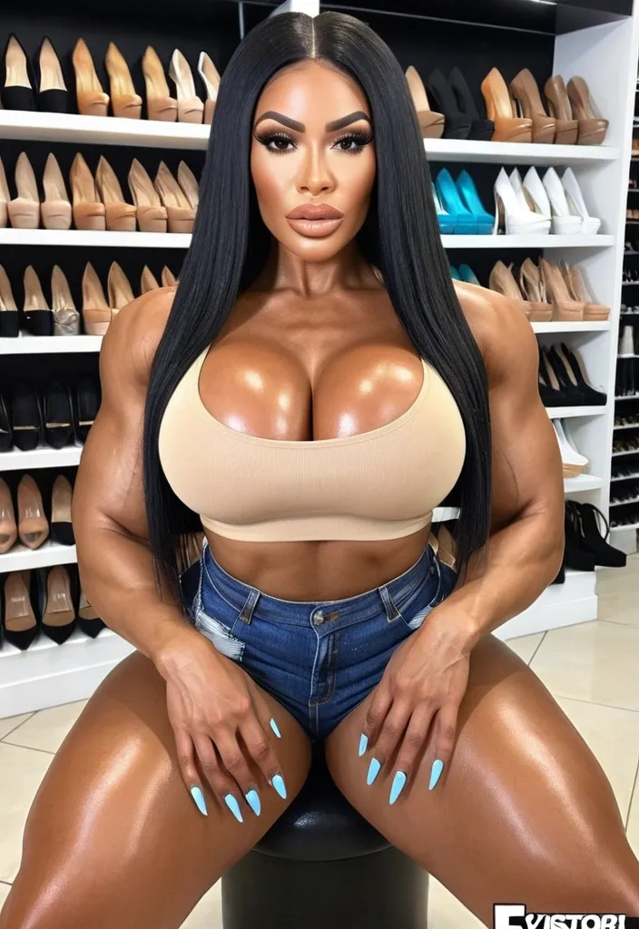 Generate Gorgeous female boss , , bimbo , hourglass body , golden brown skim complexion. abnormally massive female bodybuilder , gorgeous , close up , full lips , big booty , black hair , biracial , African-American , and Philippine woman , black straight stylish hair , feminine silhouette , too big breast , big booty , sexy thighs abs , silhouette , up close , flexing biceps , beautiful brown eyes , legs are iconic and defining physical feature , both visually and in terms of combat ability.wearing an outfit that is a striking blend of elegance , power , and femininity , designed to command attention in any room. The suit is tailored to perfection , hugging the wearer’s curves with precision while emphasizing a structured silhouette. The fabric itself is a refined grey tweed patterned with subtle white grid lines , giving the suit a texture that feels both sophisticated and modern. The blazer features broad blue lapels and gold button accents , adding a luxurious touch that elevates the look beyond typical business attire. The matching high-waisted trousers elongate the frame , further enhancing the poised and commanding effect of the ensemble.The styling choices amplify the boldness of the suit. The inner blouse is a silky , greybutton-down shirt that complements the tweed’s tone while introducing a softer , feminine balance to the sharp tailoring of the jacket. The blouse peeks out neatly from under the blazer , maintaining elegance without drawing focus away from the suit’s commanding cut. Accessories are kept minimal yet intentional: a delicate layered gold necklace and hoop earrings that add glimmers of light and luxury without overpowering the outfit. The choice of voluminous , honey-brown braids cascading down her shoulders frames the face with both confidence and glamour , completing the commanding visual.Altogether , this look communicates a blend of authority and allure. It is business-ready yet fashion-forward , balancing corporate structure with vibrant femininity. The color palette blue , grey and gold avoids being overly delicate , instead embracing the richness of texture , structure , and presence. This is the kind of ensemble that speaks to ambition , sophistication , and personal style—ideal for someone who thrives in positions of influence but insists on expressing her individuality with bold elegance. It’s not just clothing—it’s a statement of power wrapped in grace. In luxury living legs that could crush a watermelon , skirt high boots are a bold and striking statement piece , crafted in glossy black patent leather that gives them a sleek , polished finish. Rising to just below the knee , the boots feature three adjustable buckle straps along the shaft , adding both edge and detail to their design. The towering stiletto heel , paired with a thick platform sole , creates an ultra-dramatic silhouette that elongates the leg and exudes power and confidence. With their combination of shine , height , and structure , these boots perfectly balance fierce femininity with high-fashion allure. High cheekbones , prominent jawline , gorgeous big brown eyes , powerful curves , enormous breast , sitting beige tank top , blue jean shorts , voluptuous , inside nail saloon up close shot , ,