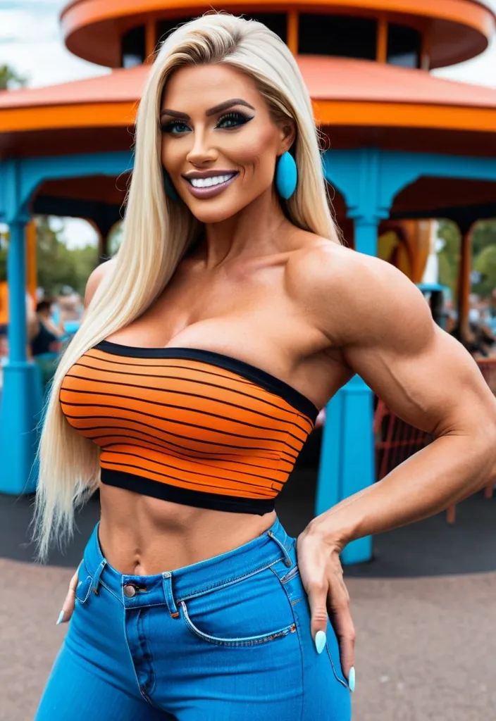 She has long , straight blonde hair that frames her face , giving her a polished and confident look. Her eyes are a bright , striking blue , and her skin tone is fair with a smooth , healthy glow.Her body is muscular , strong , and very fit — the kind of build that shows discipline and power. Her face is soft but confident , with defined cheekbones , a warm smile , and expressive eyebrows.complemented by large turquoise spherical earrings. She is wearing a tight orange-and-black horizontally striped strapless tube top that clings to and accentuates her exaggerated bust , enormous butt , paired with form-fitting high-waisted blue denim jeans that highlight her curvaceous hips and thighs. , enormous breast , enormous butt , standing in line at amusement park , stacked hourglass silhouette , small waist , ,