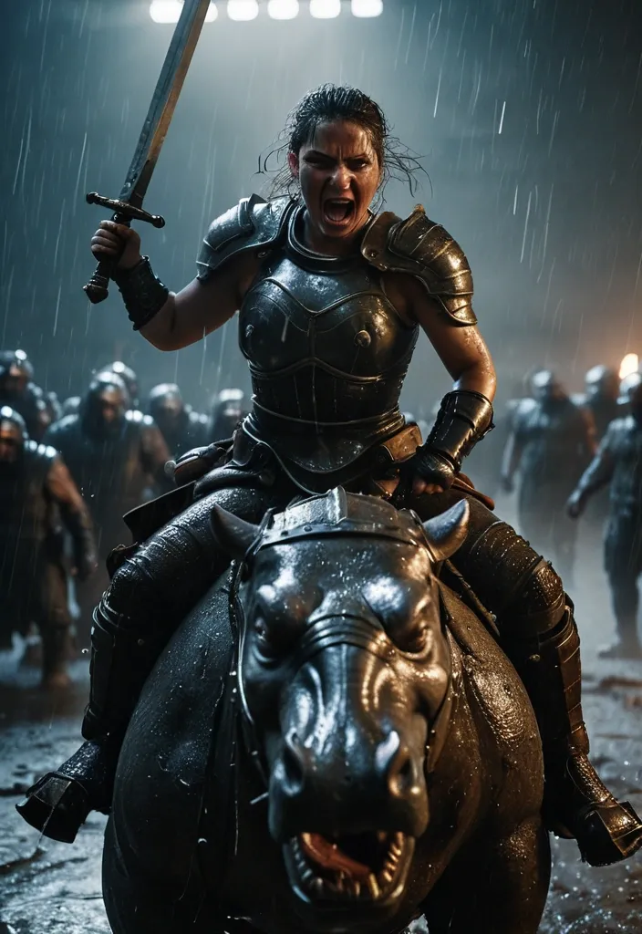 A gritty photograph showcasing a fierce , battle-hardened woman atop a massive , roaring Hippopotamus. The woman , clad in worn leather and steel armor , grips a sword , her face contorted in a grimace of effort and fury , with streaks of rain mixing with dirt across her cheek. Harsh , chiaroscuro lighting from a sudden flash of lightning illuminates the scene , casting stark shadows and highlighting the glint of wet metal amidst billowing smoke in the distant background. Shot in realistic live-action cinematography style. High dynamic range lighting , cinematic color grading , subtle film grain. Natural optical depth of field , realistic lens blur , slight handheld camera micro-movement. 50mm cinematic lens , f/4 aperture , physically accurate lighting , volumetric light diffusion. 8K level visual fidelity , highly detailed environment , believable scale and realistic crowd simulation. The scene feels like a frame from a large-budget live-action science-fiction space movie. ,