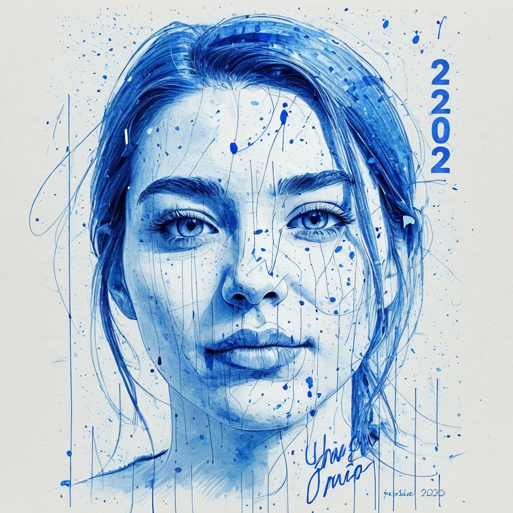 Photo drawn in blue pen sketch style , where the person in the photo should be the same as the photo given , without changing the face. Smooth ink strokes behind the portrait , splatter effects , and dynamic watercolor brush elements. Soft paper texture background in ivory/white colors. "2026" written in bold artistic blue brush font above the portrait. Below , a clean and beautiful full-year calendar layout in handwritten-style blue text. Highly detailed facial sketch , sharp line art , premium illustration quality , artistic splash effects , professional print-quality design , and 8K resolution. ,