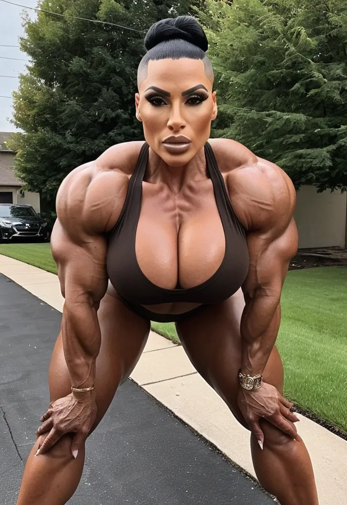 Generate Gorgeous female boss , bimbo , 42 years old , African-American woman , , , hourglass body , abnormally massive female bodybuilder , gorgeous , close up , full lips , big booty , buzz cut , black hair , hair bun , feminine silhouette , too big breast , big booty , sexy thighs abs , silhouette , up close , flexing biceps , gorgeous brown eyes , legs are iconic and defining physical feature , both visually and in terms of combat ability.wearing an outfit that is a striking blend of elegance , power , and femininity , designed to command attention in any room. The suit is tailored to perfection , hugging the wearer’s curves with precision while emphasizing a structured silhouette. The fabric itself is a refined grey tweed patterned with subtle white grid lines , giving the suit a texture that feels both sophisticated and modern. The blazer features broad blue lapels and gold button accents , adding a luxurious touch that elevates the look beyond typical business attire. The matching high-waisted trousers elongate the frame , further enhancing the poised and commanding effect of the ensemble.The styling choices amplify the boldness of the suit. The inner blouse is a silky , greybutton-down shirt that complements the tweed’s tone while introducing a softer , feminine balance to the sharp tailoring of the jacket. The blouse peeks out neatly from under the blazer , maintaining elegance without drawing focus away from the suit’s commanding cut. Accessories are kept minimal yet intentional: a delicate layered gold necklace and hoop earrings that add glimmers of light and luxury without overpowering the outfit. The choice of voluminous , honey-brown braids cascading down her shoulders frames the face with both confidence and glamour , completing the commanding visual.Altogether , this look communicates a blend of authority and allure. It is business-ready yet fashion-forward , balancing corporate structure with vibrant femininity. The color palette blue , grey and gold avoids being overly delicate , instead embracing the richness of texture , structure , and presence. This is the kind of ensemble that speaks to ambition , sophistication , and personal style—ideal for someone who thrives in positions of influence but insists on expressing her individuality with bold elegance. It’s not just clothing—it’s a statement of power wrapped in grace. In luxury living legs that could crush a watermelon , skirt high boots are a bold and striking statement piece , crafted in glossy black patent leather that gives them a sleek , polished finish. Rising to just below the knee , the boots feature three adjustable buckle straps along the shaft , adding both edge and detail to their design. The towering stiletto heel , paired with a thick platform sole , creates an ultra-dramatic silhouette that elongates the leg and exudes power and confidence. With their combination of shine , height , and structure , these boots perfectly balance fierce femininity with high-fashion allure. High cheekbones , prominent jawline , gorgeous big brown eyes , , enormous breast , wearing brown collard shirt , brown fit-it cap , brown shorts , walking on drive way carring bending over working on plants in yard ,