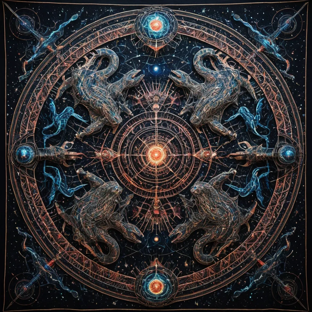 An intricately woven tapestry depicting a cosmic battle between celestial predators. The threads are made of pure light and shadow , with hyper-detailed stitching creating a sense of depth. Abstract patterns emerge from the weave , hinting at surreal forms. Rendered in a style reminiscent of ancient mythology mixed with futuristic digital art. ,