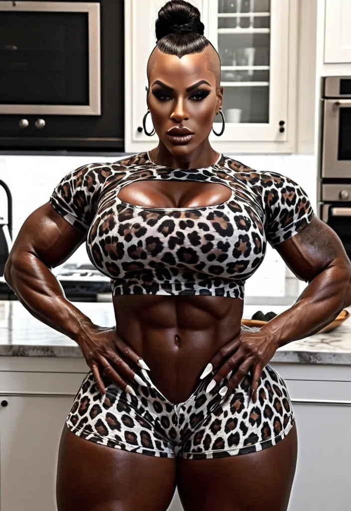 Dark skinned African American woman , female , hourglass body , abnormally massive female bodybuilder , gorgeous , close up , full lips , big booty , brown , on face and breast , Mohawk ponytail , bald shaved feminine silhouette , too big breast , big booty , sexy thighs abs , silhouette , up close , flexing biceps , beautiful green eyes , legs are iconic and defining physical feature , both visually and in terms of combat ability.wearing an outfit that is a striking blend of elegance , power , and femininity , designed to command attention in any room. The suit is tailored to perfection , hugging the wearer’s curves with precision while emphasizing a structured silhouette. The fabric itself is a refined grey tweed patterned with subtle white grid lines , giving the suit a texture that feels both sophisticated and modern. The blazer features broad blue lapels and gold button accents , adding a luxurious touch that elevates the look beyond typical business attire. The matching high-waisted trousers elongate the frame , further enhancing the poised and commanding effect of the ensemble.The styling choices amplify the boldness of the suit. The inner blouse is a silky , greybutton-down shirt that complements the tweed’s tone while introducing a softer , feminine balance to the sharp tailoring of the jacket. The blouse peeks out neatly from under the blazer , maintaining elegance without drawing focus away from the suit’s commanding cut. Accessories are kept minimal yet intentional: a delicate layered gold necklace and hoop earrings that add glimmers of light and luxury without overpowering the outfit. The choice of voluminous , honey-brown braids cascading down her shoulders frames the face with both confidence and glamour , completing the commanding visual.Altogether , this look communicates a blend of authority and allure. It is business-ready yet fashion-forward , balancing corporate structure with vibrant femininity. The color palette blue , grey and gold avoids being overly delicate , instead embracing the richness of texture , structure , and presence. This is the kind of ensemble that speaks to ambition , sophistication , and personal style—ideal for someone who thrives in positions of influence but insists on expressing her individuality with bold elegance. It’s not just clothing—it’s a statement of power wrapped in grace. In luxury living legs that could crush a watermelon , skirt high boots are a bold and striking statement piece , crafted in glossy black patent leather that gives them a sleek , polished finish. Rising to just below the knee , the boots feature three adjustable buckle straps along the shaft , adding both edge and detail to their design. The towering stiletto heel , paired with a thick platform sole , creates an ultra-dramatic silhouette that elongates the leg and exudes power and confidence. With their combination of shine , height , and structure , these boots perfectly balance fierce femininity with high-fashion allure. High cheekbones , prominent jawline , gorgeous big light reflecting hazel eyes , enormous breast , gray and black leopard print t-shirt , cargo pants shorts , cooking in kitchen , enormous butt , enormous breast , thunder thighs and hips ,