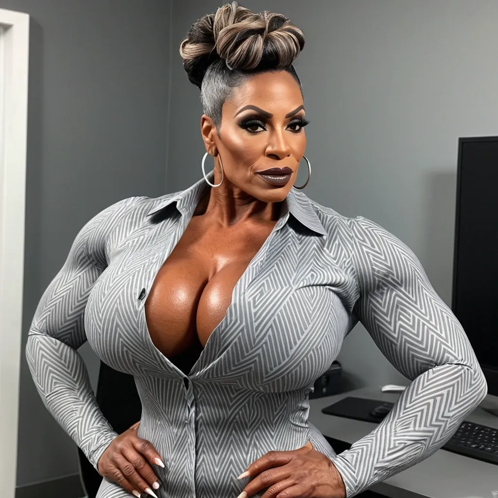 Generate Gorgeous female boss , bimbo , 42 years old , African-American woman , , , hourglass body , abnormally massive female bodybuilder , gorgeous , close up , full lips , big booty , brown pixie updo hair , short hair , feminine silhouette , too big breast , big booty , sexy thighs abs , silhouette , up close , flexing biceps , beautiful brown eyes , legs are iconic and defining physical feature , both visually and in terms of combat ability.wearing an outfit that is a striking blend of elegance , power , and femininity , designed to command attention in any room. The suit is tailored to perfection , hugging the wearer’s curves with precision while emphasizing a structured silhouette. The fabric itself is a refined grey tweed patterned with subtle white grid lines , giving the suit a texture that feels both sophisticated and modern. The blazer features broad blue lapels and gold button accents , adding a luxurious touch that elevates the look beyond typical business attire. The matching high-waisted trousers elongate the frame , further enhancing the poised and commanding effect of the ensemble.The styling choices amplify the boldness of the suit. The inner blouse is a silky , greybutton-down shirt that complements the tweed’s tone while introducing a softer , feminine balance to the sharp tailoring of the jacket. The blouse peeks out neatly from under the blazer , maintaining elegance without drawing focus away from the suit’s commanding cut. Accessories are kept minimal yet intentional: a delicate layered gold necklace and hoop earrings that add glimmers of light and luxury without overpowering the outfit. The choice of voluminous , honey-brown braids cascading down her shoulders frames the face with both confidence and glamour , completing the commanding visual.Altogether , this look communicates a blend of authority and allure. It is business-ready yet fashion-forward , balancing corporate structure with vibrant femininity. The color palette blue , grey and gold avoids being overly delicate , instead embracing the richness of texture , structure , and presence. This is the kind of ensemble that speaks to ambition , sophistication , and personal style—ideal for someone who thrives in positions of influence but insists on expressing her individuality with bold elegance. It’s not just clothing—it’s a statement of power wrapped in grace. In luxury living legs that could crush a watermelon , skirt high boots are a bold and striking statement piece , crafted in glossy black patent leather that gives them a sleek , polished finish. Rising to just below the knee , the boots feature three adjustable buckle straps along the shaft , adding both edge and detail to their design. The towering stiletto heel , paired with a thick platform sole , creates an ultra-dramatic silhouette that elongates the leg and exudes power and confidence. With their combination of shine , height , and structure , these boots perfectly balance fierce femininity with high-fashion allure. High cheekbones , prominent jawline , gorgeous big brown eyes , freckles , enormous breast , bluish gray and black chevrons designed dress work shirt , grey dress pants , full body shot , profile shot ,