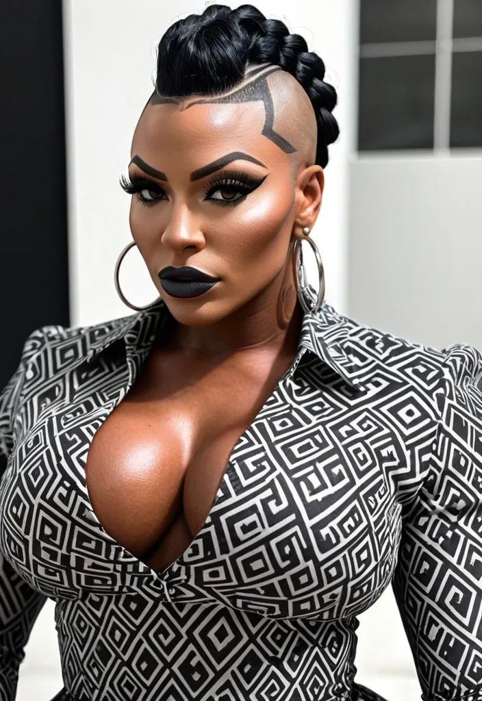 Generate Gorgeous female boss , bimbo , 24 years old , very dark-skinned African-American woman , , gorgeous hazel eyes , hourglass body , abnormally massive female bodybuilder , gorgeous , close up , full lips , big booty , braided mohawk styled mohawk , bald on the side , feminine silhouette , too big breast , big booty , sexy thighs abs , silhouette , up close , flexing biceps , beautiful hazel eyes , legs are iconic and defining physical feature , both visually and in terms of combat ability.wearing an outfit that is a striking blend of elegance , power , and femininity , designed to command attention in any room. The suit is tailored to perfection , hugging the wearer’s curves with precision while emphasizing a structured silhouette. The fabric itself is a refined grey tweed patterned with subtle white grid lines , giving the suit a texture that feels both sophisticated and modern. The blazer features broad blue lapels and gold button accents , adding a luxurious touch that elevates the look beyond typical business attire. The matching high-waisted trousers elongate the frame , further enhancing the poised and commanding effect of the ensemble.The styling choices amplify the boldness of the suit. The inner blouse is a silky , greybutton-down shirt that complements the tweed’s tone while introducing a softer , feminine balance to the sharp tailoring of the jacket. The blouse peeks out neatly from under the blazer , maintaining elegance without drawing focus away from the suit’s commanding cut. Accessories are kept minimal yet intentional: a delicate layered gold necklace and hoop earrings that add glimmers of light and luxury without overpowering the outfit. The choice of voluminous , honey-brown braids cascading down her shoulders frames the face with both confidence and glamour , completing the commanding visual.Altogether , this look communicates a blend of authority and allure. It is business-ready yet fashion-forward , balancing corporate structure with vibrant femininity. The color palette blue , grey and gold avoids being overly delicate , instead embracing the richness of texture , structure , and presence. This is the kind of ensemble that speaks to ambition , sophistication , and personal style—ideal for someone who thrives in positions of influence but insists on expressing her individuality with bold elegance. It’s not just clothing—it’s a statement of power wrapped in grace. In luxury living legs that could crush a watermelon , skirt high boots are a bold and striking statement piece , crafted in glossy black patent leather that gives them a sleek , polished finish. Rising to just below the knee , the boots feature three adjustable buckle straps along the shaft , adding both edge and detail to their design. The towering stiletto heel , paired with a thick platform sole , creates an ultra-dramatic silhouette that elongates the leg and exudes power and confidence. With their combination of shine , height , and structure , these boots perfectly balance fierce femininity with high-fashion allure. High cheekbones , prominent jawline , gorgeous big brown eyes , freckles , enormous breast , bluish gray and black chevrons designed dress work shirt , cheetah print top and skirt ,