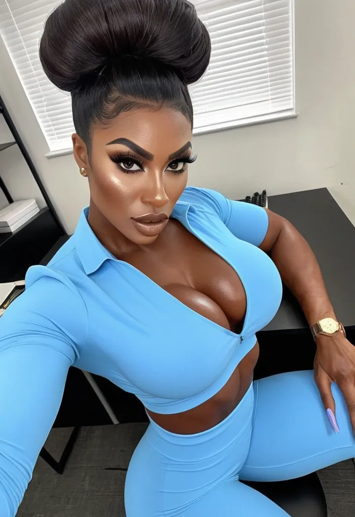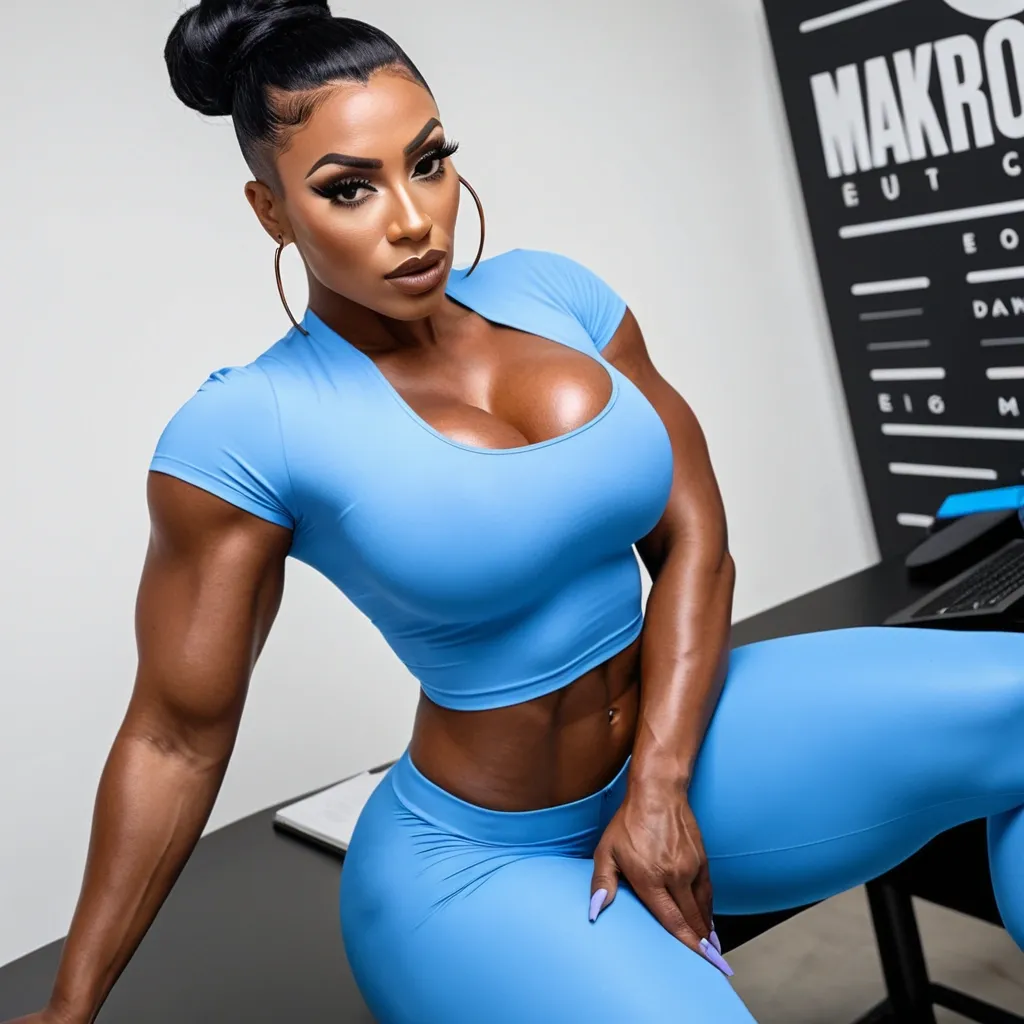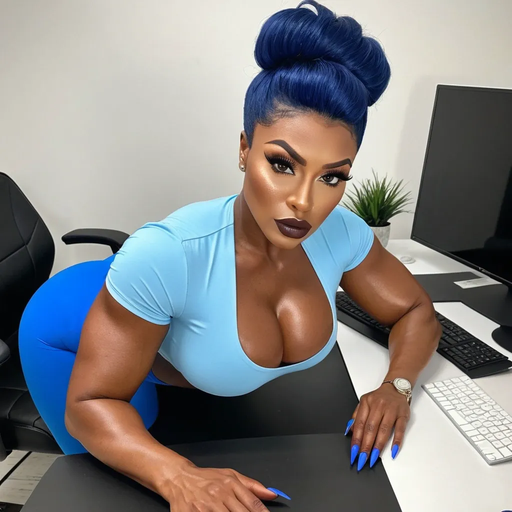 Generate Gorgeous female boss , bimbo , 24 years old , very dark-skinned African-American woman , , , hourglass body , abnormally massive female bodybuilder , gorgeous , close up , full lips , big booty , brown pixie updo hair , short hair , feminine silhouette , too big breast , big booty , sexy thighs abs , silhouette , up close , flexing biceps , beautiful brown eyes , legs are iconic and defining physical feature , both visually and in terms of combat ability.wearing an outfit that is a striking blend of elegance , power , and femininity , designed to command attention in any room. The suit is tailored to perfection , hugging the wearer’s curves with precision while emphasizing a structured silhouette. The fabric itself is a refined grey tweed patterned with subtle white grid lines , giving the suit a texture that feels both sophisticated and modern. The blazer features broad blue lapels and gold button accents , adding a luxurious touch that elevates the look beyond typical business attire. The matching high-waisted trousers elongate the frame , further enhancing the poised and commanding effect of the ensemble.The styling choices amplify the boldness of the suit. The inner blouse is a silky , greybutton-down shirt that complements the tweed’s tone while introducing a softer , feminine balance to the sharp tailoring of the jacket. The blouse peeks out neatly from under the blazer , maintaining elegance without drawing focus away from the suit’s commanding cut. Accessories are kept minimal yet intentional: a delicate layered gold necklace and hoop earrings that add glimmers of light and luxury without overpowering the outfit. The choice of voluminous , honey-brown braids cascading down her shoulders frames the face with both confidence and glamour , completing the commanding visual.Altogether , this look communicates a blend of authority and allure. It is business-ready yet fashion-forward , balancing corporate structure with vibrant femininity. The color palette blue , grey and gold avoids being overly delicate , instead embracing the richness of texture , structure , and presence. This is the kind of ensemble that speaks to ambition , sophistication , and personal style—ideal for someone who thrives in positions of influence but insists on expressing her individuality with bold elegance. It’s not just clothing—it’s a statement of power wrapped in grace. In luxury living legs that could crush a watermelon , skirt high boots are a bold and striking statement piece , crafted in glossy black patent leather that gives them a sleek , polished finish. Rising to just below the knee , the boots feature three adjustable buckle straps along the shaft , adding both edge and detail to their design. The towering stiletto heel , paired with a thick platform sole , creates an ultra-dramatic silhouette that elongates the leg and exudes power and confidence. With their combination of shine , height , and structure , these boots perfectly balance fierce femininity with high-fashion allure. High cheekbones , prominent jawline , gorgeous big brown eyes , freckles , enormous breast , bent forward with her elbows resting on a desk and hips pushed back , wearing a fitted light-blue short-sleeve top , high-waisted blue leggings , and purple high heels. , gorgeous hazel eyes ,