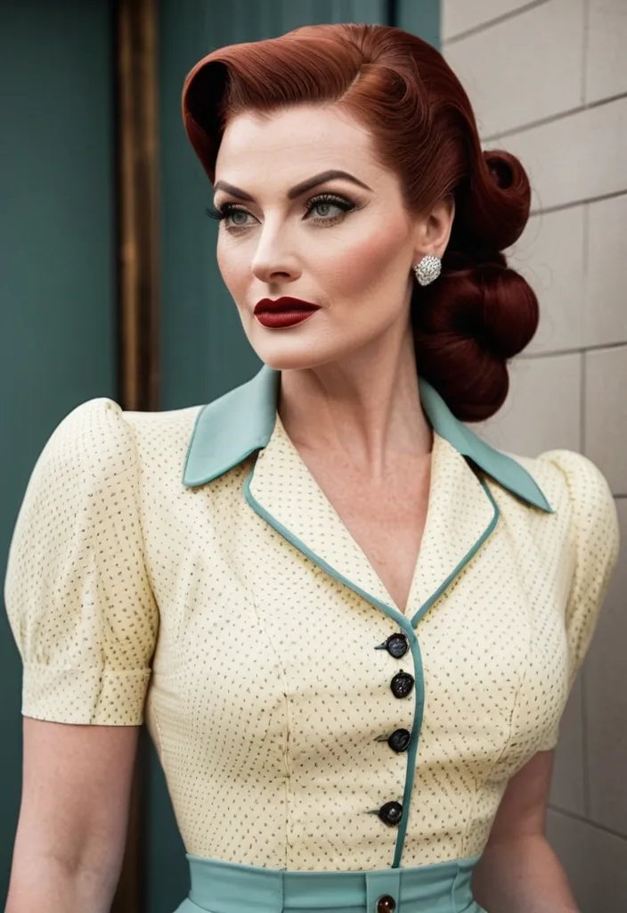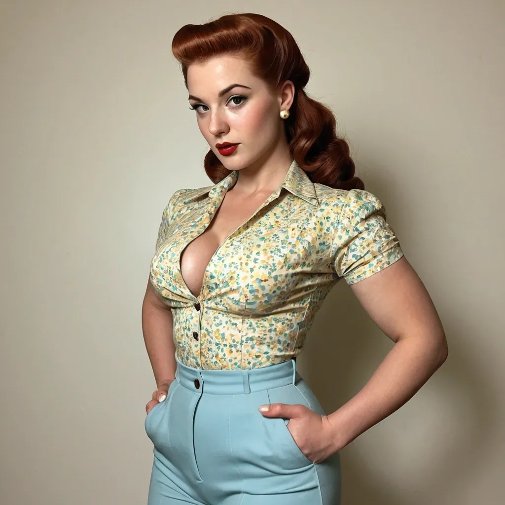 Face•She has a strong , symmetrical face with a defined jawline and high cheekbones.•Her skin is fair with light freckles , giving her a natural , slightly vintage look.•Eyes are light-colored (blue-green) , sharp and focused , with well-shaped eyebrows.•Nose is straight and refined.•Lips are full , with natural-toned lipstick.•Overall expression is calm , confident , and serious — almost like a classic 1940s film actress.⸻Body•She has a curvy , hourglass figure with a narrow waist and wider hips.•Her build looks strong but feminine , not skinny — more of a fit , full , and shapely physique.•Chest is full , waist is tight , and hips/thighs are wide , giving a very balanced silhouette.•Posture is upright and confident , shoulders back , standing with control.⸻Hairstyle•Hair color is deep red / auburn.•Styled in a vintage 1940s-inspired wave , with volume on top and a smooth , sculpted curl pattern.•The hair is pulled back into a long , thick braided ponytail that rests over her shoulder.•The style looks neat , elegant , and very intentional — not casual.⸻Clothing•Top:•A fitted , button-up blouse with a floral pattern (yellow and green on light fabric).•The blouse is tight around the waist and chest , giving a classic retro silhouette.•Sleeves are short , and the collar is open slightly at the top.•Bottom:•High-waisted light blue pants , very fitted through the hips and thighs.•The high waist emphasizes her hourglass shape.•Fabric looks smooth and tailored , similar to retro or pin-up style clothing.•Accessories:•Gold drop earrings.•Light makeup with eyeliner and soft lipstick.⸻Overall vibeShe looks like a mix of:•1940s / 1950s pin-up style•modern fitness/curvy model•confident , elegant , strong woman•clean , classy , not flashy lips , big booty , redheaded , freckles on face and breast , braided design hair , feminine silhouette , too big breast , big booty , sexy thighs abs , silhouette , up close , flexing biceps , beautiful green eyes , legs are iconic and defining physical feature , both visually and in terms of combat ability. Massive breast , massive cleavage , ,