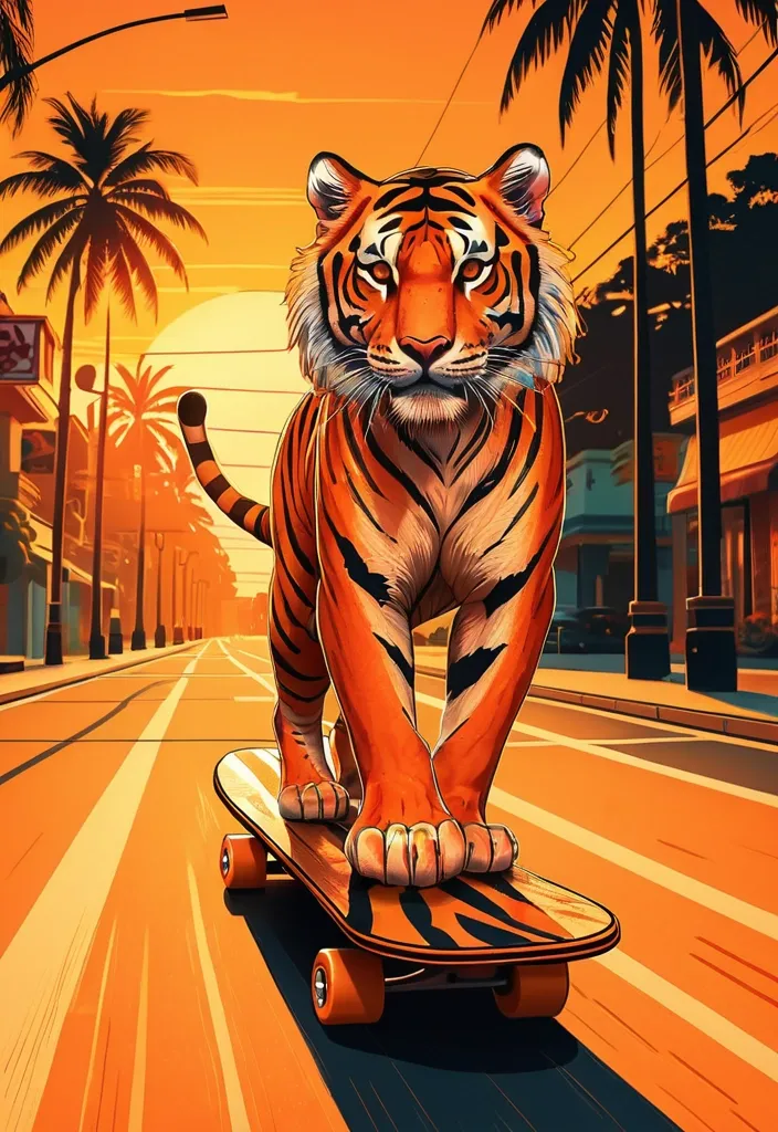 A Bengal tiger riding a skateboard down a palm-lined street at sunset. All four paws visible , the tiger pushing with its left hind paw , balancing dynamically on the board. Vibrant orange and black fur , dramatic golden-orange lighting from the setting sun. Poster-style illustration , bold colors , slightly stylized , in vintage asian art style ,