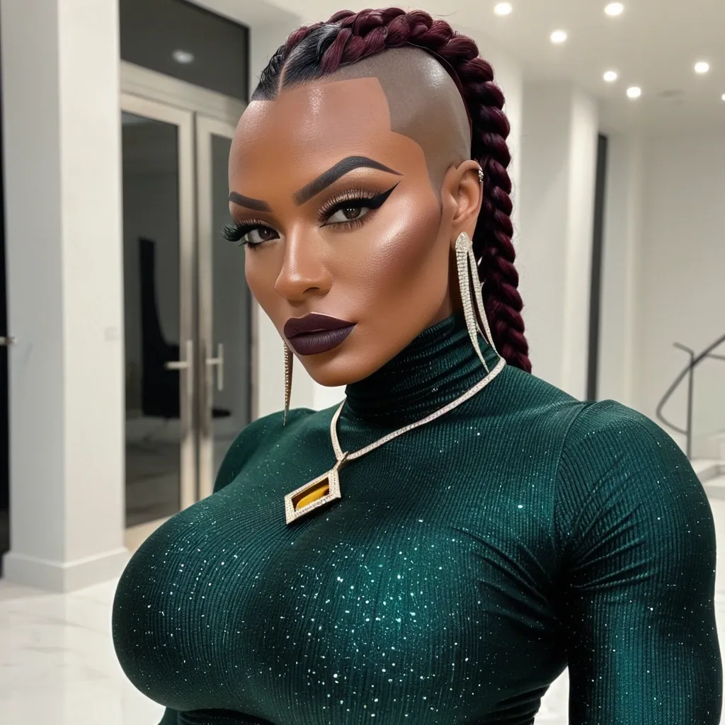 Generate Gorgeous female boss , bimbo , 24 years old , very dark-skinned African-American woman , hourglass body , abnormally massive female bodybuilder , gorgeous , close up , full lips , big booty , black and dark burgundy colored hair , braided fashionable designed mohawk , bald on the side , feminine silhouette , too big breast , big booty , sexy thighs abs , silhouette , up close , flexing biceps , beautiful hazek eyes , legs are iconic and defining physical feature , both visually and in terms of combat ability.wearing an outfit that is a striking blend of elegance , power , and femininity , designed to command attention in any room. The suit is tailored to perfection , hugging the wearer’s curves with precision while emphasizing a structured silhouette. The fabric itself is a refined grey tweed patterned with subtle white grid lines , giving the suit a texture that feels both sophisticated and modern. The blazer features broad blue lapels and gold button accents , adding a luxurious touch that elevates the look beyond typical business attire. The matching high-waisted trousers elongate the frame , further enhancing the poised and commanding effect of the ensemble.The styling choices amplify the boldness of the suit. The inner blouse is a silky , greybutton-down shirt that complements the tweed’s tone while introducing a softer , feminine balance to the sharp tailoring of the jacket. The blouse peeks out neatly from under the blazer , maintaining elegance without drawing focus away from the suit’s commanding cut. Accessories are kept minimal yet intentional: a delicate layered gold necklace and hoop earrings that add glimmers of light and luxury without overpowering the outfit. The choice of voluminous , honey-brown braids cascading down her shoulders frames the face with both confidence and glamour , completing the commanding visual.Altogether , this look communicates a blend of authority and allure. It is business-ready yet fashion-forward , balancing corporate structure with vibrant femininity. The color palette blue , grey and gold avoids being overly delicate , instead embracing the richness of texture , structure , and presence. This is the kind of ensemble that speaks to ambition , sophistication , and personal style—ideal for someone who thrives in positions of influence but insists on expressing her individuality with bold elegance. It’s not just clothing—it’s a statement of power wrapped in grace. In luxury living legs that could crush a watermelon , skirt high boots are a bold and striking statement piece , crafted in glossy black patent leather that gives them a sleek , polished finish. Rising to just below the knee , the boots feature three adjustable buckle straps along the shaft , adding both edge and detail to their design. The towering stiletto heel , paired with a thick platform sole , creates an ultra-dramatic silhouette that elongates the leg and exudes power and confidence. With their combination of shine , height , and structure , these boots perfectly balance fierce femininity with high-fashion allure. High cheekbones , prominent jawline , gorgeous big hazel eyes , freckles , enormous breast , wearing emerald dark green , turtleneck top sparkly ball dress , double slit dress , solver hoop earrings , diamond necklace , with yellow diamond emblem , stacked hourglass silhouette , enormous breast ,