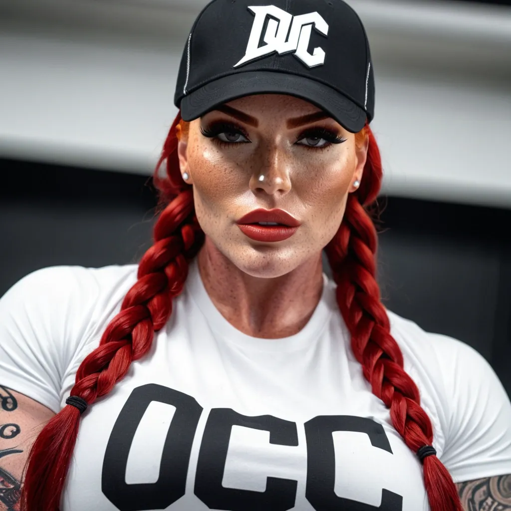 Generate Gorgeous female boss , bimbo , hourglass body , abnormally massive female bodybuilder , gorgeous , close up , full lips , big booty , redheaded , freckles on face and breast , braided design hair , feminine silhouette , too big breast , big booty , sexy thighs abs , silhouette , up close , flexing biceps , beautiful green eyes , legs are iconic and defining physical feature , both visually and in terms of combat ability.wearing an outfit that is a striking blend of elegance , power , and femininity , designed to command attention in any room. The suit is tailored to perfection , hugging the wearer’s curves with precision while emphasizing a structured silhouette. The fabric itself is a refined grey tweed patterned with subtle white grid lines , giving the suit a texture that feels both sophisticated and modern. The blazer features broad blue lapels and gold button accents , adding a luxurious touch that elevates the look beyond typical business attire. The matching high-waisted trousers elongate the frame , further enhancing the poised and commanding effect of the ensemble.The styling choices amplify the boldness of the suit. The inner blouse is a silky , greybutton-down shirt that complements the tweed’s tone while introducing a softer , feminine balance to the sharp tailoring of the jacket. The blouse peeks out neatly from under the blazer , maintaining elegance without drawing focus away from the suit’s commanding cut. Accessories are kept minimal yet intentional: a delicate layered gold necklace and hoop earrings that add glimmers of light and luxury without overpowering the outfit. The choice of voluminous , honey-brown braids cascading down her shoulders frames the face with both confidence and glamour , completing the commanding visual.Altogether , this look communicates a blend of authority and allure. It is business-ready yet fashion-forward , balancing corporate structure with vibrant femininity. The color palette blue , grey and gold avoids being overly delicate , instead embracing the richness of texture , structure , and presence. This is the kind of ensemble that speaks to ambition , sophistication , and personal style—ideal for someone who thrives in positions of influence but insists on expressing her individuality with bold elegance. It’s not just clothing—it’s a statement of power wrapped in grace. In luxury living legs that could crush a watermelon , skirt high boots are a bold and striking statement piece , crafted in glossy black patent leather that gives them a sleek , polished finish. Rising to just below the knee , the boots feature three adjustable buckle straps along the shaft , adding both edge and detail to their design. The towering stiletto heel , paired with a thick platform sole , creates an ultra-dramatic silhouette that elongates the leg and exudes power and confidence. With their combination of shine , height , and structure , these boots perfectly balance fierce femininity with high-fashion allure. Up close shot , black baseball cap with the words DC on the baseball cap in white , black leather jacket , white t-shirt , enormous breast , full body shot ,