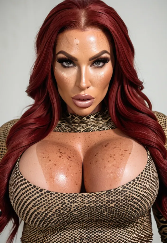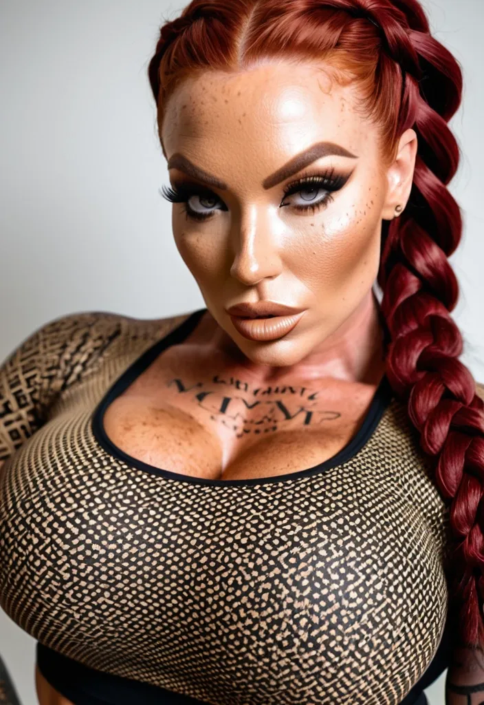 Generate Gorgeous female boss , bimbo , hourglass body , abnormally massive female bodybuilder , gorgeous , close up , full lips , big booty , redheaded , freckles on face and breast , braided design hair , feminine silhouette , too big breast , big booty , sexy thighs abs , silhouette , up close , flexing biceps , beautiful green eyes , legs are iconic and defining physical feature , both visually and in terms of combat ability.wearing an outfit that is a striking blend of elegance , power , and femininity , designed to command attention in any room. The suit is tailored to perfection , hugging the wearer’s curves with precision while emphasizing a structured silhouette. The fabric itself is a refined grey tweed patterned with subtle white grid lines , giving the suit a texture that feels both sophisticated and modern. The blazer features broad blue lapels and gold button accents , adding a luxurious touch that elevates the look beyond typical business attire. The matching high-waisted trousers elongate the frame , further enhancing the poised and commanding effect of the ensemble.The styling choices amplify the boldness of the suit. The inner blouse is a silky , greybutton-down shirt that complements the tweed’s tone while introducing a softer , feminine balance to the sharp tailoring of the jacket. The blouse peeks out neatly from under the blazer , maintaining elegance without drawing focus away from the suit’s commanding cut. Accessories are kept minimal yet intentional: a delicate layered gold necklace and hoop earrings that add glimmers of light and luxury without overpowering the outfit. The choice of voluminous , honey-brown braids cascading down her shoulders frames the face with both confidence and glamour , completing the commanding visual.Altogether , this look communicates a blend of authority and allure. It is business-ready yet fashion-forward , balancing corporate structure with vibrant femininity. The color palette blue , grey and gold avoids being overly delicate , instead embracing the richness of texture , structure , and presence. This is the kind of ensemble that speaks to ambition , sophistication , and personal style—ideal for someone who thrives in positions of influence but insists on expressing her individuality with bold elegance. It’s not just clothing—it’s a statement of power wrapped in grace. In luxury living legs that could crush a watermelon , skirt high boots are a bold and striking statement piece , crafted in glossy black patent leather that gives them a sleek , polished finish. Rising to just below the knee , the boots feature three adjustable buckle straps along the shaft , adding both edge and detail to their design. The towering stiletto heel , paired with a thick platform sole , creates an ultra-dramatic silhouette that elongates the leg and exudes power and confidence. With their combination of shine , height , and structure , these boots perfectly balance fierce femininity with high-fashion allure. Massive breast , massive cleavage , Up close shot , black , beige and gold subtle squard pattern velvet t-shirt ,