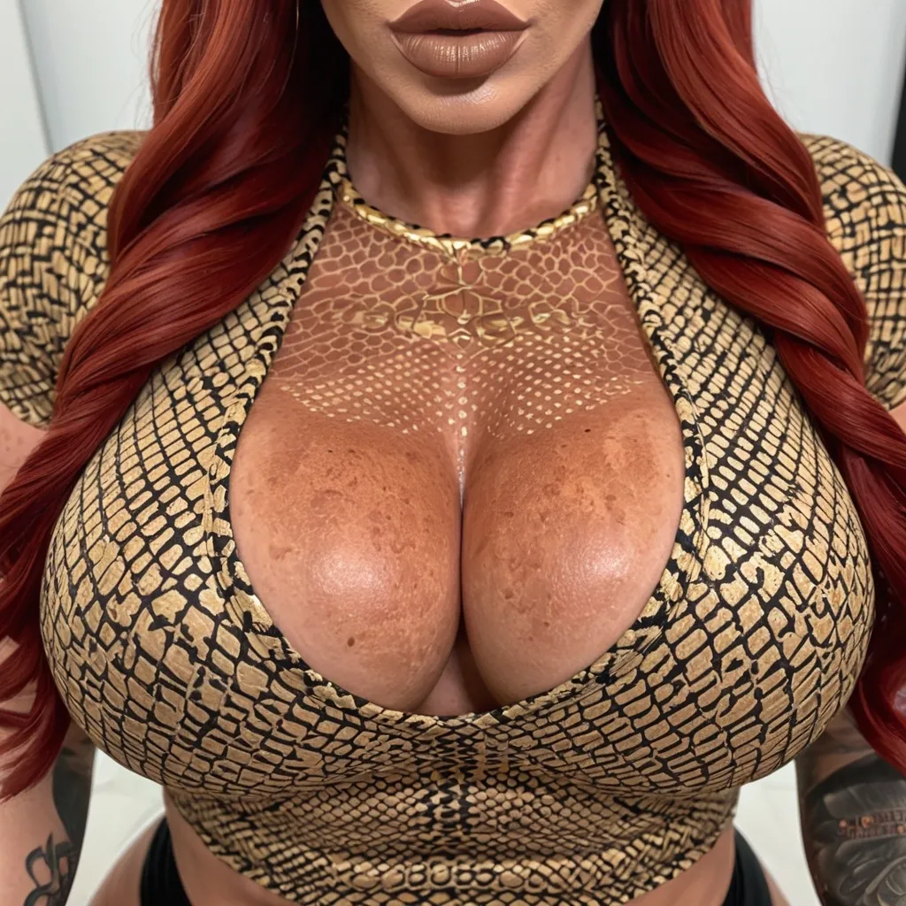 Generate Gorgeous female boss , bimbo , hourglass body , abnormally massive female bodybuilder , gorgeous , close up , full lips , big booty , redheaded , freckles on face and breast , braided design hair , feminine silhouette , too big breast , big booty , sexy thighs abs , silhouette , up close , flexing biceps , beautiful green eyes , legs are iconic and defining physical feature , both visually and in terms of combat ability.wearing an outfit that is a striking blend of elegance , power , and femininity , designed to command attention in any room. The suit is tailored to perfection , hugging the wearer’s curves with precision while emphasizing a structured silhouette. The fabric itself is a refined grey tweed patterned with subtle white grid lines , giving the suit a texture that feels both sophisticated and modern. The blazer features broad blue lapels and gold button accents , adding a luxurious touch that elevates the look beyond typical business attire. The matching high-waisted trousers elongate the frame , further enhancing the poised and commanding effect of the ensemble.The styling choices amplify the boldness of the suit. The inner blouse is a silky , greybutton-down shirt that complements the tweed’s tone while introducing a softer , feminine balance to the sharp tailoring of the jacket. The blouse peeks out neatly from under the blazer , maintaining elegance without drawing focus away from the suit’s commanding cut. Accessories are kept minimal yet intentional: a delicate layered gold necklace and hoop earrings that add glimmers of light and luxury without overpowering the outfit. The choice of voluminous , honey-brown braids cascading down her shoulders frames the face with both confidence and glamour , completing the commanding visual.Altogether , this look communicates a blend of authority and allure. It is business-ready yet fashion-forward , balancing corporate structure with vibrant femininity. The color palette blue , grey and gold avoids being overly delicate , instead embracing the richness of texture , structure , and presence. This is the kind of ensemble that speaks to ambition , sophistication , and personal style—ideal for someone who thrives in positions of influence but insists on expressing her individuality with bold elegance. It’s not just clothing—it’s a statement of power wrapped in grace. In luxury living legs that could crush a watermelon , skirt high boots are a bold and striking statement piece , crafted in glossy black patent leather that gives them a sleek , polished finish. Rising to just below the knee , the boots feature three adjustable buckle straps along the shaft , adding both edge and detail to their design. The towering stiletto heel , paired with a thick platform sole , creates an ultra-dramatic silhouette that elongates the leg and exudes power and confidence. With their combination of shine , height , and structure , these boots perfectly balance fierce femininity with high-fashion allure. Massive breast , massive cleavage , Up close shot She wears a sleeveless mustard-yellow fitted top with white fur trim at the shoulders , paired with dark blue reinforced pants featuring brown leather straps and a utility belt , finished with tan work boots and brown gloves for a rugged , adventurer-style outfit. ,
