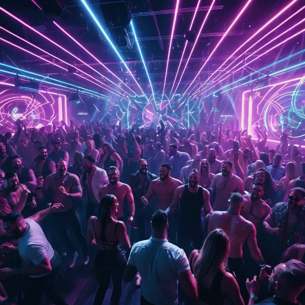 A vibrant nightclub scene full of young people dancing and enjoying a party , DJ booth with lights , neon colors , laser beams , smoke effects , energetic crowd , people laughing and having fun , modern dance club , realistic photography style , high detail , cinematic lighting , 4K , dynamic composition , nightlife energy ,