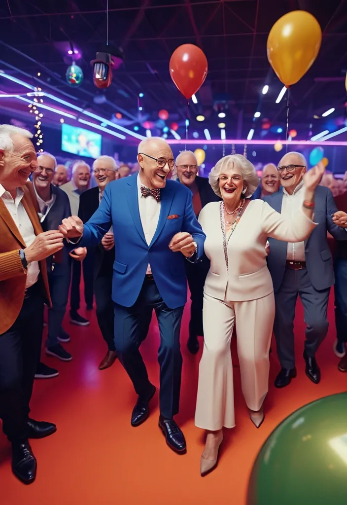 Celebración de cumpleaños de 60 años en un boliche moderno con ambiente familiar , mujer de 60 años festejando rodeada de familiares y amigos , personas de diferentes edades (adultos , jóvenes y adultos mayores) bailando y disfrutando , decoración festiva con globos , luces de colores y detalles elegantes , pista de baile iluminada , DJ robot con luces LED animando la fiesta , música alegre , ambiente cálido y emocionante , personas sonriendo , riendo y compartiendo , estilo fotografía realista , alta calidad , iluminación cinematográfica , colores vibrantes , composición dinámica , alto nivel de detalle , 4K , escena alegre y festiva , enfoque en la celebración y la conexión familiar ,