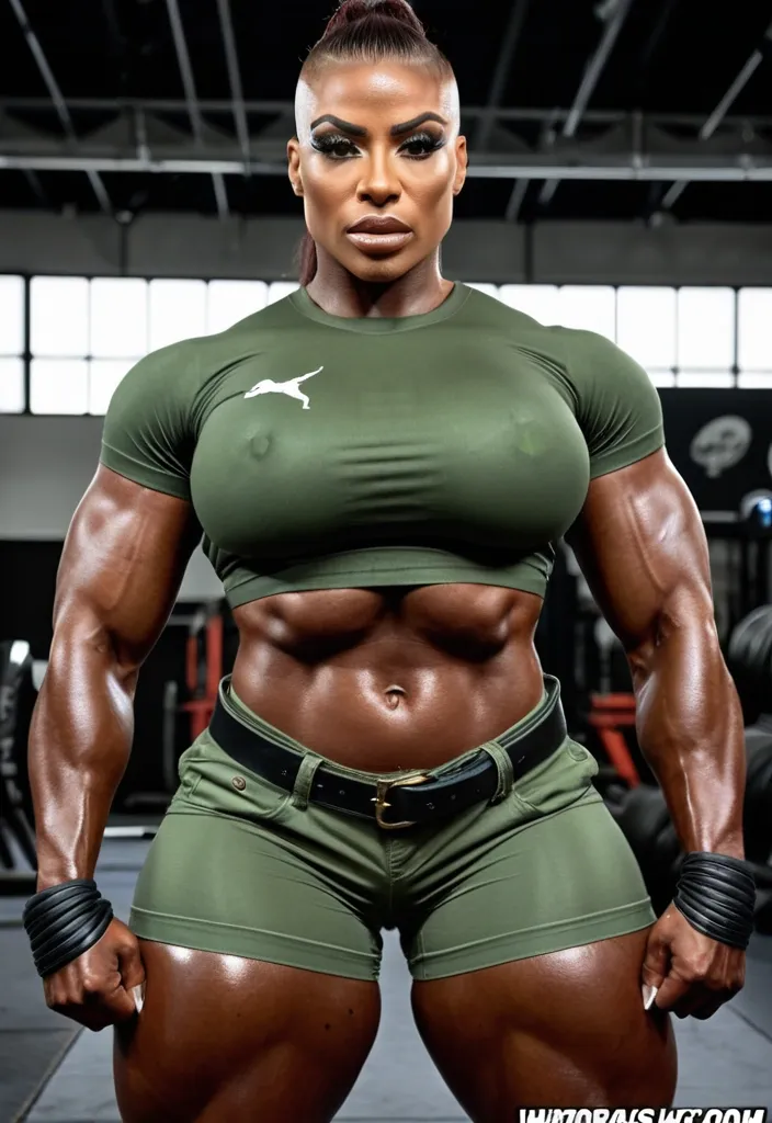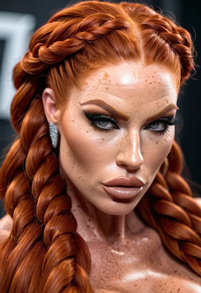 Generate Gorgeous female boss , bimbo , hourglass body , abnormally massive female bodybuilder , gorgeous , close up , full lips , big booty , redheaded , freckles on face and breast , braided design hair , feminine silhouette , too big breast , big booty , sexy thighs abs , silhouette , up close , flexing biceps , beautiful green eyes , legs are iconic and defining physical feature , both visually and in terms of combat ability.wearing an outfit that is a striking blend of elegance , power , and femininity , designed to command attention in any room. The suit is tailored to perfection , hugging the wearer’s curves with precision while emphasizing a structured silhouette. The fabric itself is a refined grey tweed patterned with subtle white grid lines , giving the suit a texture that feels both sophisticated and modern. The blazer features broad blue lapels and gold button accents , adding a luxurious touch that elevates the look beyond typical business attire. The matching high-waisted trousers elongate the frame , further enhancing the poised and commanding effect of the ensemble.The styling choices amplify the boldness of the suit. The inner blouse is a silky , greybutton-down shirt that complements the tweed’s tone while introducing a softer , feminine balance to the sharp tailoring of the jacket. The blouse peeks out neatly from under the blazer , maintaining elegance without drawing focus away from the suit’s commanding cut. Accessories are kept minimal yet intentional: a delicate layered gold necklace and hoop earrings that add glimmers of light and luxury without overpowering the outfit. The choice of voluminous , honey-brown braids cascading down her shoulders frames the face with both confidence and glamour , completing the commanding visual.Altogether , this look communicates a blend of authority and allure. It is business-ready yet fashion-forward , balancing corporate structure with vibrant femininity. The color palette blue , grey and gold avoids being overly delicate , instead embracing the richness of texture , structure , and presence. This is the kind of ensemble that speaks to ambition , sophistication , and personal style—ideal for someone who thrives in positions of influence but insists on expressing her individuality with bold elegance. It’s not just clothing—it’s a statement of power wrapped in grace. In luxury living legs that could crush a watermelon , skirt high boots are a bold and striking statement piece , crafted in glossy black patent leather that gives them a sleek , polished finish. Rising to just below the knee , the boots feature three adjustable buckle straps along the shaft , adding both edge and detail to their design. The towering stiletto heel , paired with a thick platform sole , creates an ultra-dramatic silhouette that elongates the leg and exudes power and confidence. With their combination of shine , height , and structure , these boots perfectly balance fierce femininity with high-fashion allure. Massive breast , massive cleavage , Up close shot , satin house robe. ,