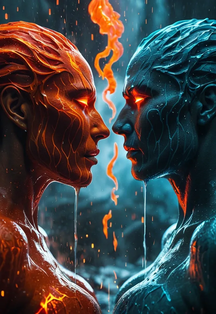A dramatic , cinematic close-up of two human faces facing each other , symbolizing FIRE versus WATER—the conceptual duality of emotion and power. On the left , a divine female figure formed entirely of flowing water and ice , with translucent , radiant skin , dynamic splashing droplets , frozen crystalline textures , and a soft mist swirling around her face. On the right , a powerful male figure made of molten lava and fire , with cracked volcanic skin radiating vivid orange magma , intense flames rising upward , and glowing red sparks scattering through the air. Their foreheads and noses almost touching , creating intense emotional tension and a symbolic balance between opposites. Background filled with atmospheric fog , vapor , and energy particles , blending cool blue tones on the left and warm orange tones. Ultra-detailed textures , hyper-realistic skin simulation , cinematic lighting , volumetric fog , high contrast , fantastic concept art , depth of field , sharp focus , HDR , 8K resolution , Unreal Engine-style rendering. Branding elements: Add subtle , glossy watermark text "AB Kris 31.03.26" in the bottom right corner. Optional: Subtle , futuristic typography "Powered by AB Kris 31.03.26" integrated into the mist or particles. Consistent color grading: contrast between teal and lava orange. ,