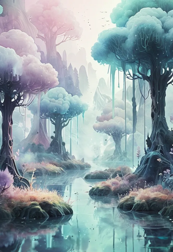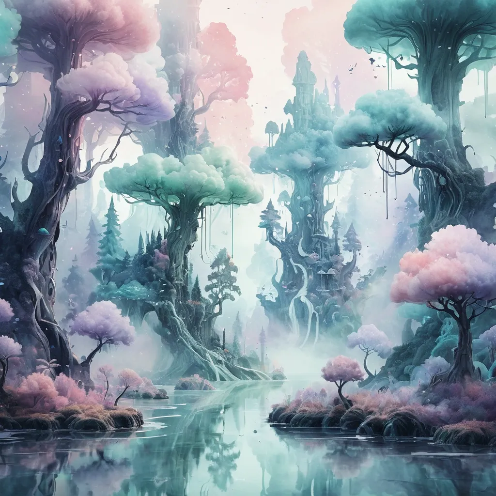 "Create a highly detailed , visually stunning digital artwork of a mystical forest with floating islands , in the style of watercolor fantasy , with pastel shades colors , emphasizing a calm and dreamy atmosphere. The artwork should have soft mist and painterly brush strokes and be suitable for a digital print. Focus on creativity , originality , and cinematic composition." ,