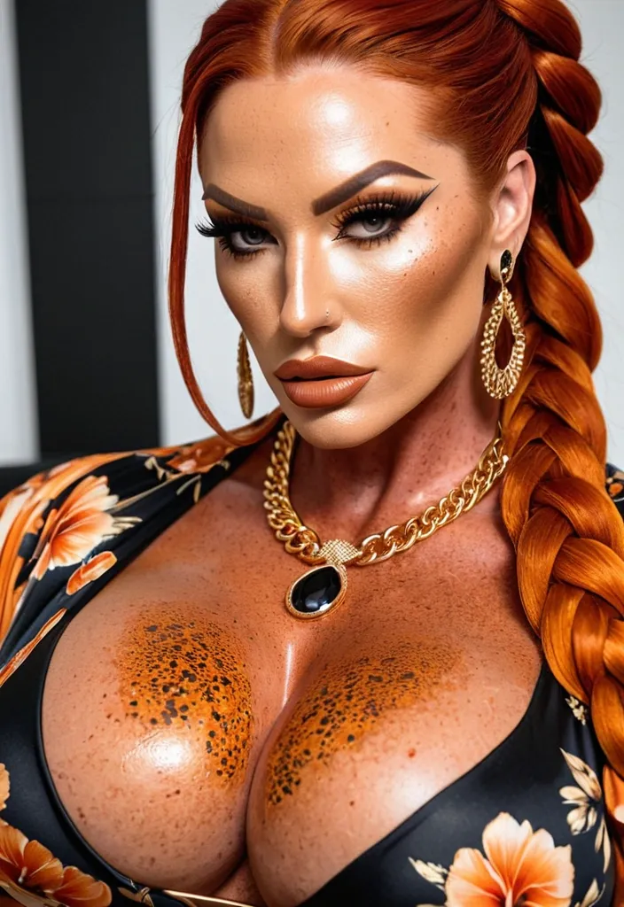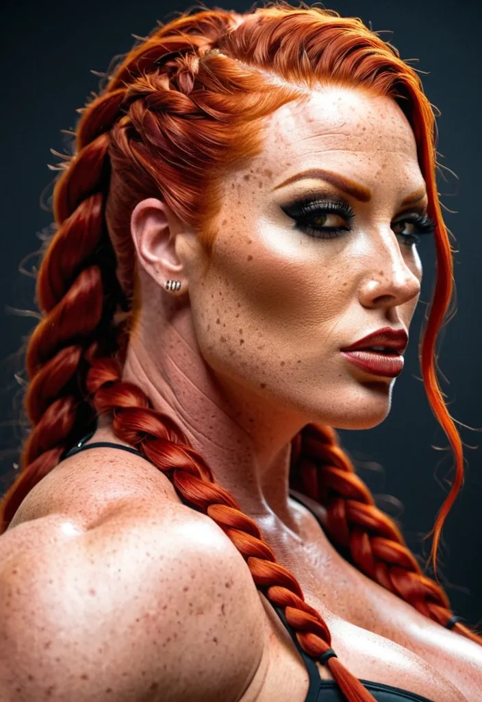 Generate Gorgeous female boss , bimbo , hourglass body , abnormally massive female bodybuilder , gorgeous , close up , full lips , big booty , redheaded , freckles on face and breast , braided design hair , feminine silhouette , too big breast , big booty , sexy thighs abs , silhouette , up close , flexing biceps , beautiful green eyes , legs are iconic and defining physical feature , both visually and in terms of combat ability.wearing an outfit that is a striking blend of elegance , power , and femininity , designed to command attention in any room. The suit is tailored to perfection , hugging the wearer’s curves with precision while emphasizing a structured silhouette. The fabric itself is a refined grey tweed patterned with subtle white grid lines , giving the suit a texture that feels both sophisticated and modern. The blazer features broad blue lapels and gold button accents , adding a luxurious touch that elevates the look beyond typical business attire. The matching high-waisted trousers elongate the frame , further enhancing the poised and commanding effect of the ensemble.The styling choices amplify the boldness of the suit. The inner blouse is a silky , greybutton-down shirt that complements the tweed’s tone while introducing a softer , feminine balance to the sharp tailoring of the jacket. The blouse peeks out neatly from under the blazer , maintaining elegance without drawing focus away from the suit’s commanding cut. Accessories are kept minimal yet intentional: a delicate layered gold necklace and hoop earrings that add glimmers of light and luxury without overpowering the outfit. The choice of voluminous , honey-brown braids cascading down her shoulders frames the face with both confidence and glamour , completing the commanding visual.Altogether , this look communicates a blend of authority and allure. It is business-ready yet fashion-forward , balancing corporate structure with vibrant femininity. The color palette blue , grey and gold avoids being overly delicate , instead embracing the richness of texture , structure , and presence. This is the kind of ensemble that speaks to ambition , sophistication , and personal style—ideal for someone who thrives in positions of influence but insists on expressing her individuality with bold elegance. It’s not just clothing—it’s a statement of power wrapped in grace. In luxury living legs that could crush a watermelon , skirt high boots are a bold and striking statement piece , crafted in glossy black patent leather that gives them a sleek , polished finish. Rising to just below the knee , the boots feature three adjustable buckle straps along the shaft , adding both edge and detail to their design. The towering stiletto heel , paired with a thick platform sole , creates an ultra-dramatic silhouette that elongates the leg and exudes power and confidence. With their combination of shine , height , and structure , these boots perfectly balance fierce femininity with high-fashion allure. Scowl on face , massive cleavage , gold hoop earrings , gold necklace with sapphire , enormous breast , full hody shot , dark navy strapless tank top and black skirt , full body shot ,