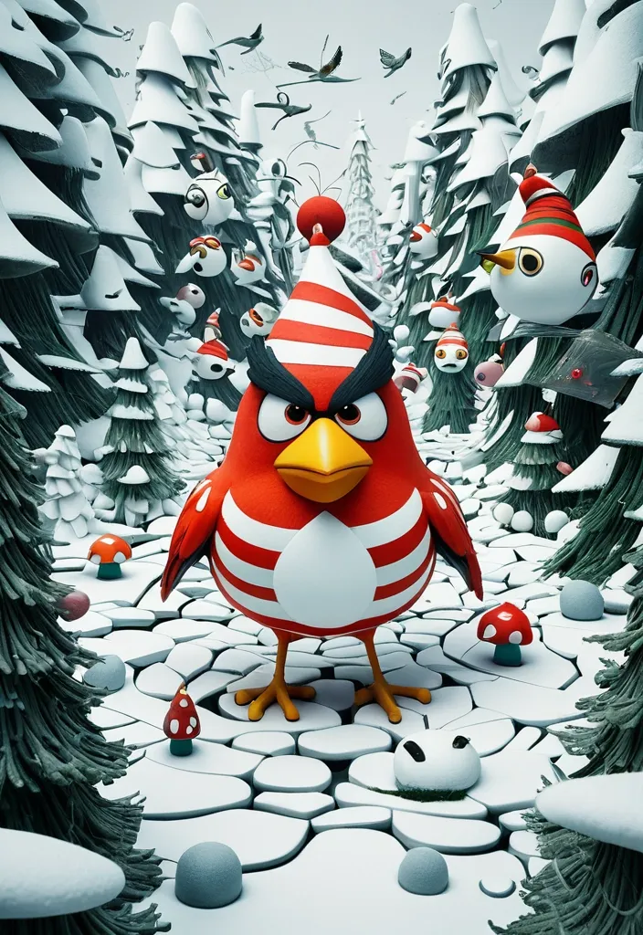 A color-psychedelic collage depicting an Angry Bird (a Finnish video game series and media franchise created by Jaakko Iisalo and owned by Rovio Entertainment) , dreamlike landscape composed of snow and white and other optical illusion patterns , surreal organic , Bird-face-like lifeforms and biomorphic structures , layered and arranged as if cut , assembled , and recomposed from multiple surreal realities. The scene feels like a collaged ecosystem built from perception itself — Bird face embedded in plants , Bird floating independently , Birds growing on stalks , cones , mushrooms , and soft sculptural forms. Some Birds are realistic and detailed , others simplified , graphic , striped , or abstracted. A voluptuous milf , wearing a Christmas costume with a xmas cap and playing a guitar. Elements overlap unnaturally , with intentional scale mismatches and layered planes that flatten and re-expand space. ,