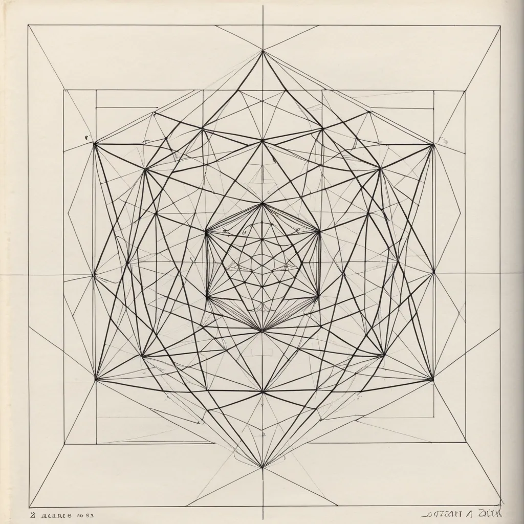 give me a real drawing on pencil about 6 ideas of technical and artistic geometric illustrations for the book Flatland of Edwin A. Abbott as a cover image. It should regard geometric figures , solids and also the various dimensions. the images should regard perspectives , geometric drawings , designed as real person. ,