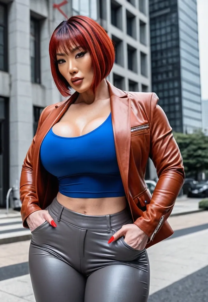 Generate Gorgeous female boss , bimbo , hourglass body , Japanese woman , abnormally massive female bodybuilder , gorgeous , close up , full lips , big booty , red hair , short bob-cut hair , , feminine silhouette , too big breast , big booty , sexy thighs abs , silhouette , up close , flexing biceps , beautiful brown eyes , legs are iconic and defining physical feature , both visually and in terms of combat ability.wearing an outfit that is a striking blend of elegance , power , and femininity , designed to command attention in any room. Outfit tailored to perfection , hugging the wearer’s curves with precision while emphasizing a structured silhouette. The fabric texture that feels both sophisticated and modern. The tank top features a luxurious touch that elevates the look beyond typical attire. The matching high-waisted shorts elongate the frame , further enhancing the poised and commanding effect of the ensemble.The styling choices amplify the boldness of the outfit. The outfit complements the tweed’s tone while introducing a softer , feminine balance to the sharp tailoring of the outfit. She is maintaining elegance without drawing focus away from the outfit commanding cut. Accessories are kept minimal yet intentional: a delicate layered gold necklace and hoop earrings that add glimmers of light and luxury without overpowering the outfit. The choice of voluminous , short bob-cut hair cascading down to her shoulders frames the face with both confidence and glamour , completing the commanding visual.Altogether , this look communicates a blend of authority and allure. It is fashion-forward , balancing corporate structure with vibrant femininity. The color palette blue tank top and grey short avoids being overly delicate , instead embracing the richness of texture , structure , and presence. This is the kind of ensemble that speaks to ambition , sophistication , and personal style—ideal for someone who thrives in positions of influence but insists on expressing her individuality with bold elegance. It’s not just clothing—it’s a statement of power wrapped in grace. In luxury living legs that could crush a cement block , she has a bold and striking statement piece , her big lips heart shaped lips in glossy red that gives them a sleek , polished finish. Adding both edge and detail to their design. The towering stiletto heel , paired with a thick platform sole , creates an ultra-dramatic silhouette that elongates the leg and exudes power and confidence. With their combination of shine , height , and structure , these boots perfectly balance fierce femininity with high-fashion allure. High cheekbones , prominent jawline , gorgeous big brown eyes , enormous breast , blue tank top , high rise grey pants , enormous butt , brown leather jacket ,