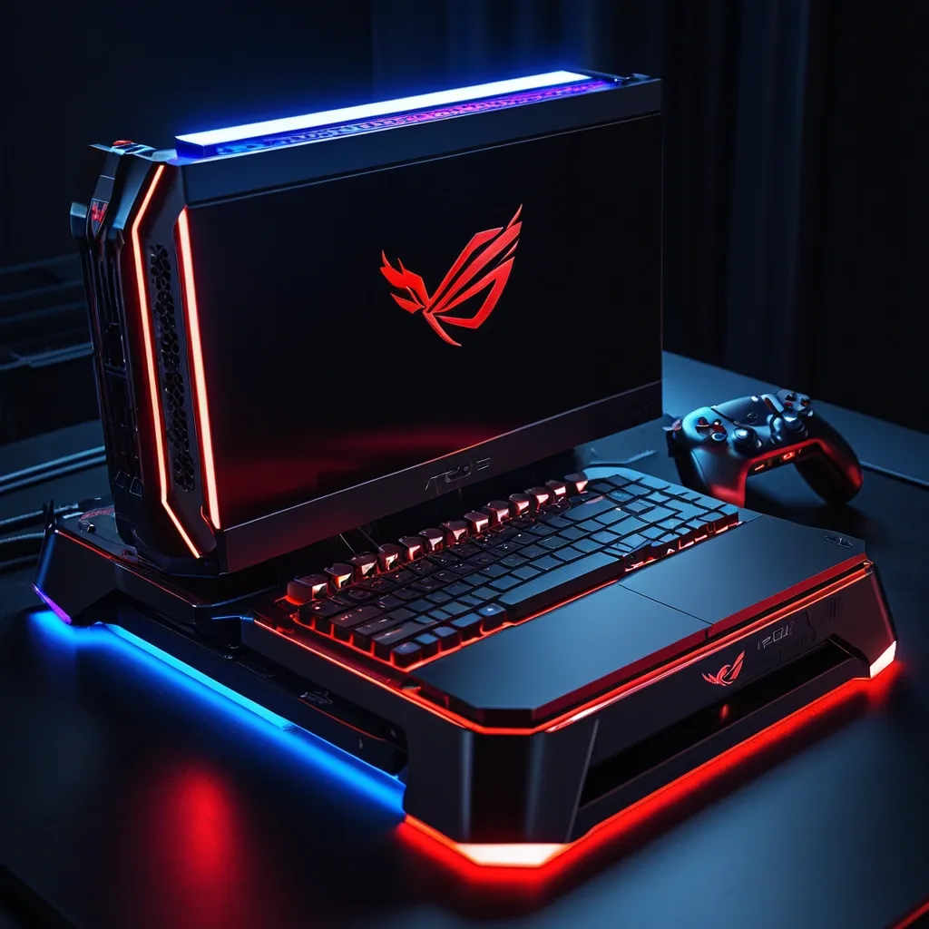 "Фотореалистичная компактная игровая установка , состоящая из портативной консоли Asus ROG Ally , подключенной к небольшой вертикальной док-станции eGPU с видеокартой GeForce RTX 4070 Ті с двумя вентиляторами. Стиль киберпанк , аккуратная укладка кабелей , неоновая подсветка красного и синего цвета. Вид сбоку на темном столе из закаленного стекла , высокая детализация , профессиональное студийное освещение." ,