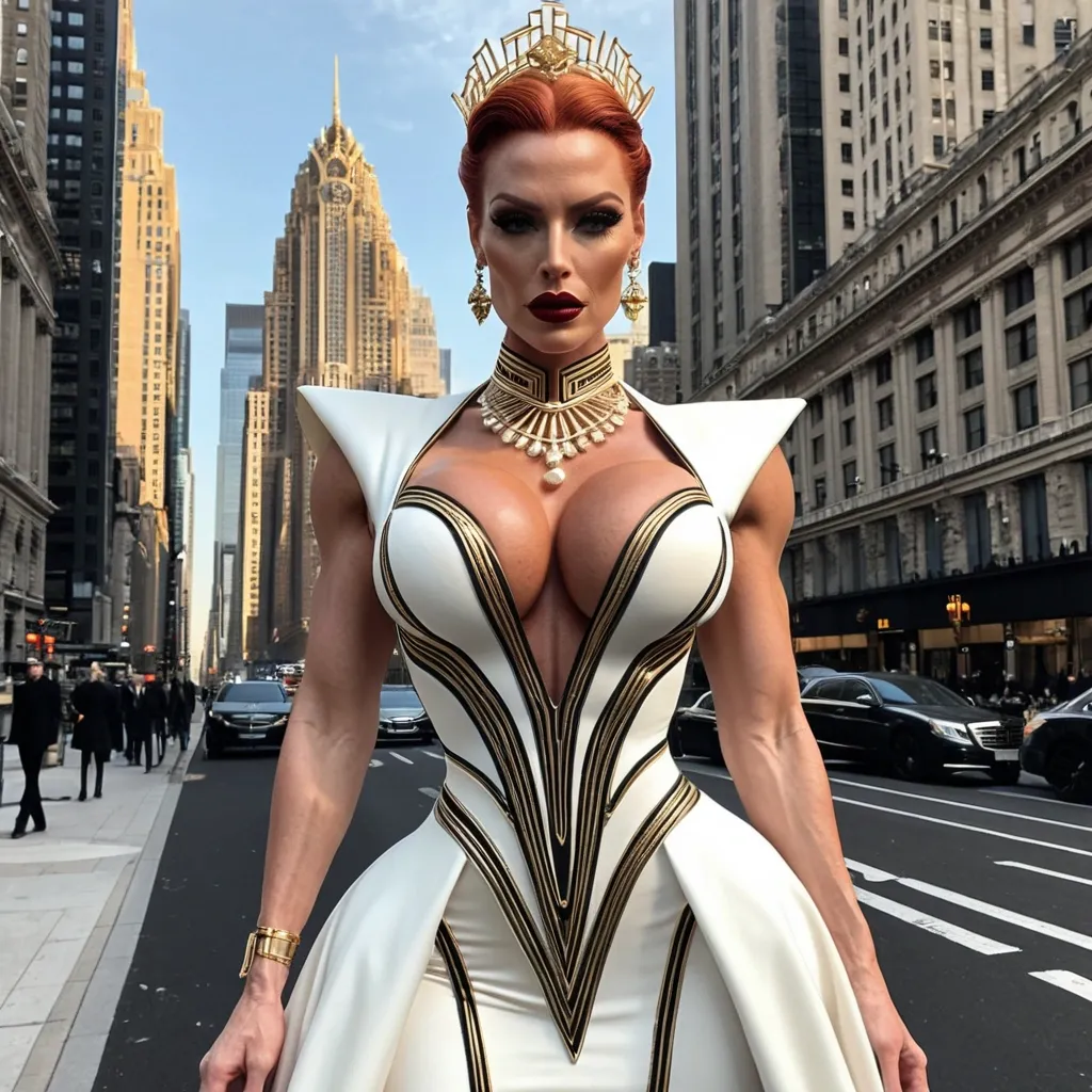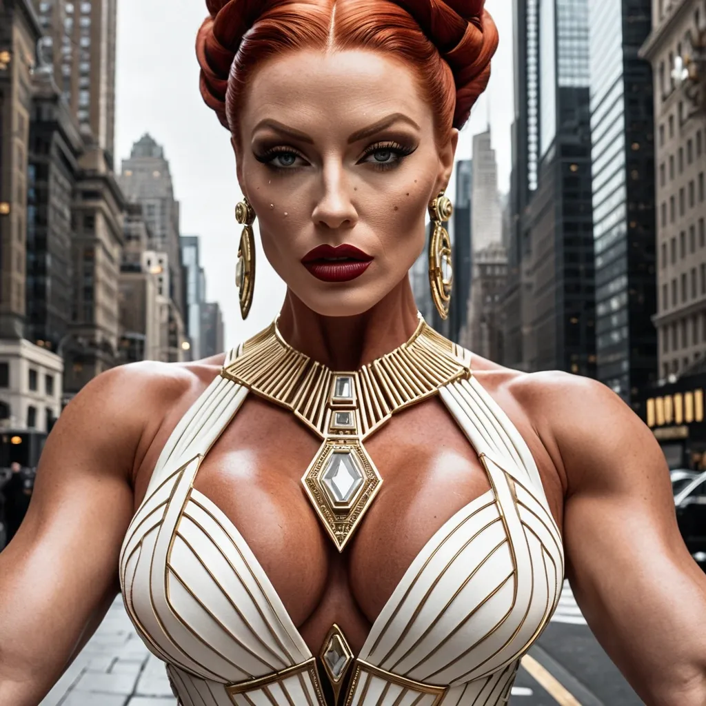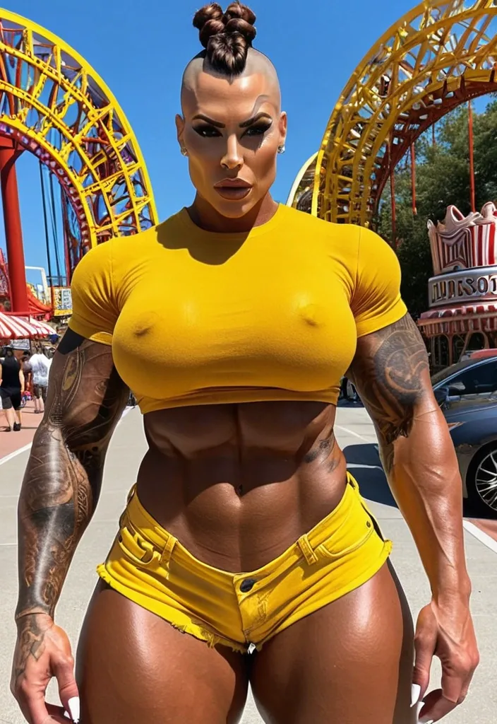Generate Gorgeous female boss , bimbo , hourglass body , abnormally massive female bodybuilder , gorgeous , close up , full lips , big booty , redheaded , freckles on face and breast , braided design hair , feminine silhouette , too big breast , big booty , sexy thighs abs , silhouette , up close , flexing biceps , beautiful green eyes , legs are iconic and defining physical feature , both visually and in terms of combat ability.wearing an outfit that is a striking blend of elegance , power , and femininity , designed to command attention in any room. The suit is tailored to perfection , hugging the wearer’s curves with precision while emphasizing a structured silhouette. The fabric itself is a refined grey tweed patterned with subtle white grid lines , giving the suit a texture that feels both sophisticated and modern. The blazer features broad blue lapels and gold button accents , adding a luxurious touch that elevates the look beyond typical business attire. The matching high-waisted trousers elongate the frame , further enhancing the poised and commanding effect of the ensemble.The styling choices amplify the boldness of the suit. The inner blouse is a silky , greybutton-down shirt that complements the tweed’s tone while introducing a softer , feminine balance to the sharp tailoring of the jacket. The blouse peeks out neatly from under the blazer , maintaining elegance without drawing focus away from the suit’s commanding cut. Accessories are kept minimal yet intentional: a delicate layered gold necklace and hoop earrings that add glimmers of light and luxury without overpowering the outfit. The choice of voluminous , honey-brown braids cascading down her shoulders frames the face with both confidence and glamour , completing the commanding visual.Altogether , this look communicates a blend of authority and allure. It is business-ready yet fashion-forward , balancing corporate structure with vibrant femininity. The color palette blue , grey and gold avoids being overly delicate , instead embracing the richness of texture , structure , and presence. This is the kind of ensemble that speaks to ambition , sophistication , and personal style—ideal for someone who thrives in positions of influence but insists on expressing her individuality with bold elegance. It’s not just clothing—it’s a statement of power wrapped in grace. In luxury living legs that could crush a watermelon , skirt high boots are a bold and striking statement piece , crafted in glossy black patent leather that gives them a sleek , polished finish. Rising to just below the knee , the boots feature three adjustable buckle straps along the shaft , adding both edge and detail to their design. The towering stiletto heel , paired with a thick platform sole , creates an ultra-dramatic silhouette that elongates the leg and exudes power and confidence. With their combination of shine , height , and structure , these boots perfectly balance fierce femininity with high-fashion allure. Massive breast , massive cleavage , driving and sitting a car , wearing a black , blue amd gray floral t-shirt , gray denim pants , enormous butt ,