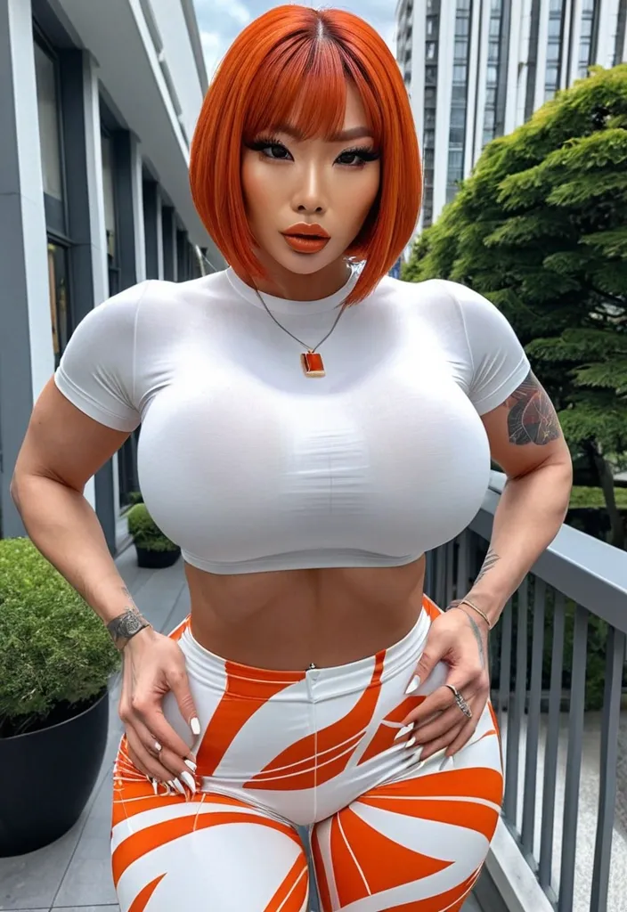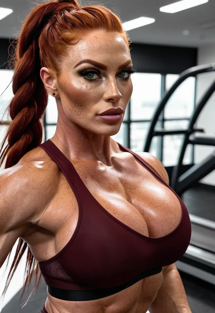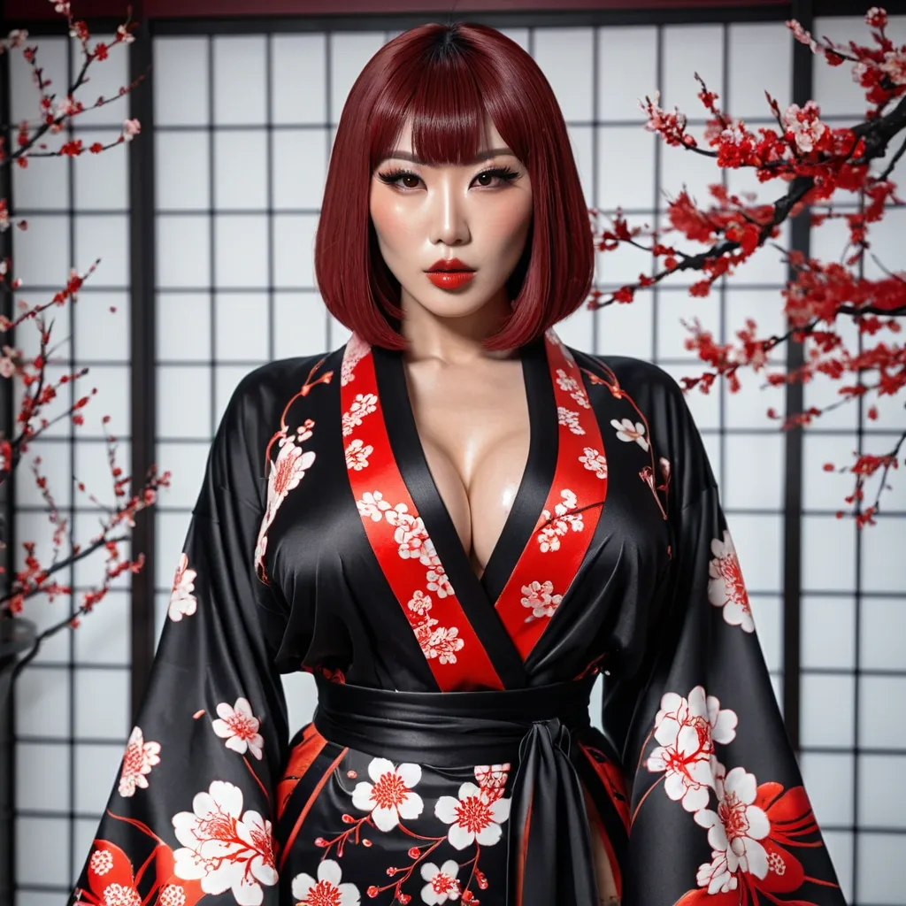 Image is an oil digital illustration featuring a powerful female warrior in a dynamic pose. She has long , flowing black hair and a determined expression. Her skin is light , and she has striking facial features with bold makeup. The character is adorned in a metallic silver and red armor , with intricate designs and a prominent chest plate. Her arms are wrapped in black and red fabric , and she holds a large , imposing sword with a weathered blade. The background is concrete grey and blood red , enhancing the dramatic and intense atmosphere of the scene. The overall composition is bold and visually striking , emphasizing strength and confidence. ,