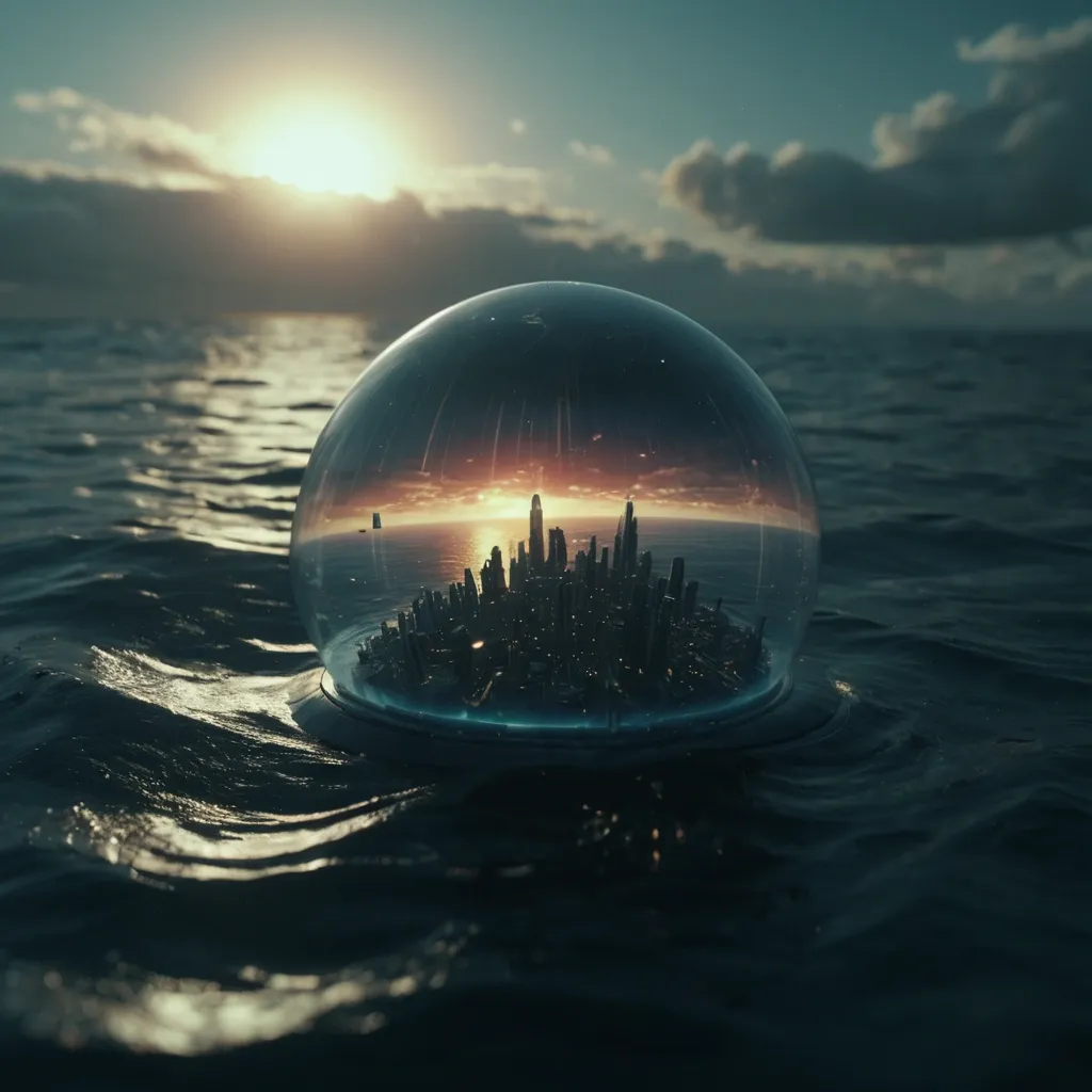 Cinematic deep space shot , camera completely locked and stationary. A massive half-rounded glass Seashell mega-structure city built flying over surface of the ocean. The structure is perfectly still and unchanged , showing the entire base clearly from a wide angle. slight inhalation around bright light sources , shallow depth of field , metamorphic lens look , 35mm motion picture film aesthetic , organic imperfections , moody atmosphere , frame looks extracted from a high-budget feature film. Dramatic sunset lighting over the water surface , creating highlights on the long distance dive in air whale. High Detail , 4K , Masterpiece , Rendered in Octane , ,