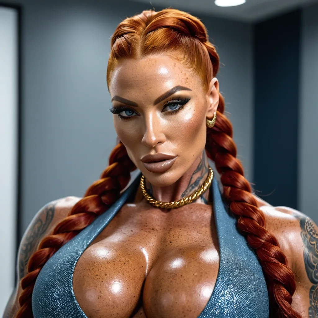 Generate Gorgeous female boss , bimbo , hourglass body , abnormally massive female bodybuilder , gorgeous , close up , full lips , big booty , redheaded , freckles on face and breast , braided design hair , feminine silhouette , too big breast , big booty , sexy thighs abs , silhouette , up close , flexing biceps , beautiful green eyes , legs are iconic and defining physical feature , both visually and in terms of combat ability.wearing an outfit that is a striking blend of elegance , power , and femininity , designed to command attention in any room. The suit is tailored to perfection , hugging the wearer’s curves with precision while emphasizing a structured silhouette. The fabric itself is a refined grey tweed patterned with subtle white grid lines , giving the suit a texture that feels both sophisticated and modern. The blazer features broad blue lapels and gold button accents , adding a luxurious touch that elevates the look beyond typical business attire. The matching high-waisted trousers elongate the frame , further enhancing the poised and commanding effect of the ensemble.The styling choices amplify the boldness of the suit. The inner blouse is a silky , greybutton-down shirt that complements the tweed’s tone while introducing a softer , feminine balance to the sharp tailoring of the jacket. The blouse peeks out neatly from under the blazer , maintaining elegance without drawing focus away from the suit’s commanding cut. Accessories are kept minimal yet intentional: a delicate layered gold necklace and hoop earrings that add glimmers of light and luxury without overpowering the outfit. The choice of voluminous , honey-brown braids cascading down her shoulders frames the face with both confidence and glamour , completing the commanding visual.Altogether , this look communicates a blend of authority and allure. It is business-ready yet fashion-forward , balancing corporate structure with vibrant femininity. The color palette blue , grey and gold avoids being overly delicate , instead embracing the richness of texture , structure , and presence. This is the kind of ensemble that speaks to ambition , sophistication , and personal style—ideal for someone who thrives in positions of influence but insists on expressing her individuality with bold elegance. It’s not just clothing—it’s a statement of power wrapped in grace. ,